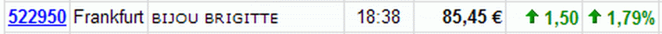 Bijou mag sicherlich ein interessantes Unternehmen mit interessanten Zahlen sein. Aber alleine schon die Tatsache das das Geschäftsmodell jedem zugänglich ist ( geht ruhig mal rein in die lowbudget Klamottenbuden wie NewYorker, taliewali, Street one, H&M etc... die bieten alle ihren billig Schmuck an) macht die Aktie langfristig völlig uninteressant.