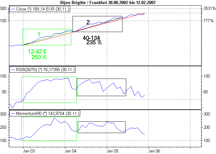 gordong November 15, 2005 · bearbeitet November 15, 2005 von gordong @Savini: Meine Frage zielte ja darauf ab, dass zwischen Juni 2003 und 2004 der RSI deutlich fiel, die Kurse aber stiegen (und verglichen mit den Monaten davor stiegen sie doch sogar stärker!?). Die Charteinstellung, die Du da nimmst, ist ungeeignet, da es sich um einen linear dargestellten Chart handelt. Stelle die Skalierung auf logarithmisch bei OnVista etc. ein wie in der angehängten Grafik. Wenn Du Indikatoren verstehen willst, siehe Dir die zugrundeliegende Formel an. Ein bischen Mathe-Kenntnis leicht über Pisa-Niveau reicht dafür aus. Das ist nicht abwertend gemeint, sondern soll unterstreichen, wie primitiv diese Indikatoren oftmals sind. Das Momentum ist quasi die erste Ableitung einer Funktion, es wird ausschließlich der Grad der Steigung gemessen. In einem halblogarithmischen Chart kann man das auch mit dem Auge abschätzen. (In einem linearen wird das Normalsterblichen weniger einfach möglich sein.) Was ist ein halblogarithmischer Chart? Wie Du siehst, zog der Steigungsgrad bei Bijou ab Ende 2002 deutlich an. Zuvor gab es damals auch ein schönes Einstiegssignal. Diesen Beitrag teilen Link zum Beitrag
