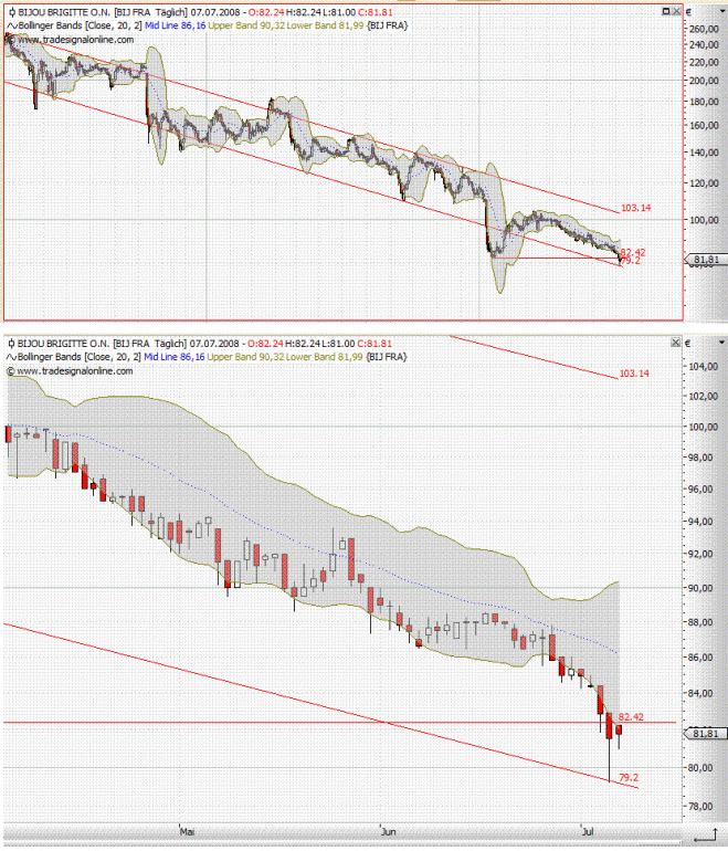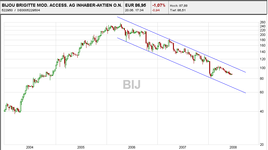 mikelowrey Juni 21, 2008 · bearbeitet Juni 21, 2008 von Value Investor TA-Update: Der 2-jährige Abwärtstrend ist noch intakt. Interessant wird ob die 80 € halten. Ich war heute mit meiner Freundin in der Stadt. Sie hat u.a. bei Bijou nach Ohrringen geschaut und ist auch fündig geworden. Ich muss sagen es war die Hölle los In dem kleinen Laden, vielleicht 30m², war es total voll, alle Altersklassen waren vertreten, man konnte sich kaum noch bewegen . Die Frau an der Kasse war im Dauereinsatz. Klar, die Konkurrenz ist da, bei Galeria Kaufhof z.B. gab es auch viel Modeschmuck und vielleicht 70m entfernt von Bijou ist ein weiterer Modeschmuck Laden, Creole oder so, Preise sind vergleichbar, vielleicht etwas günstiger als bei Bijou, dort und auch bei Kaufhof war aber so gut wie nichts los. Value Investor Diesen Beitrag teilen Link zum Beitrag