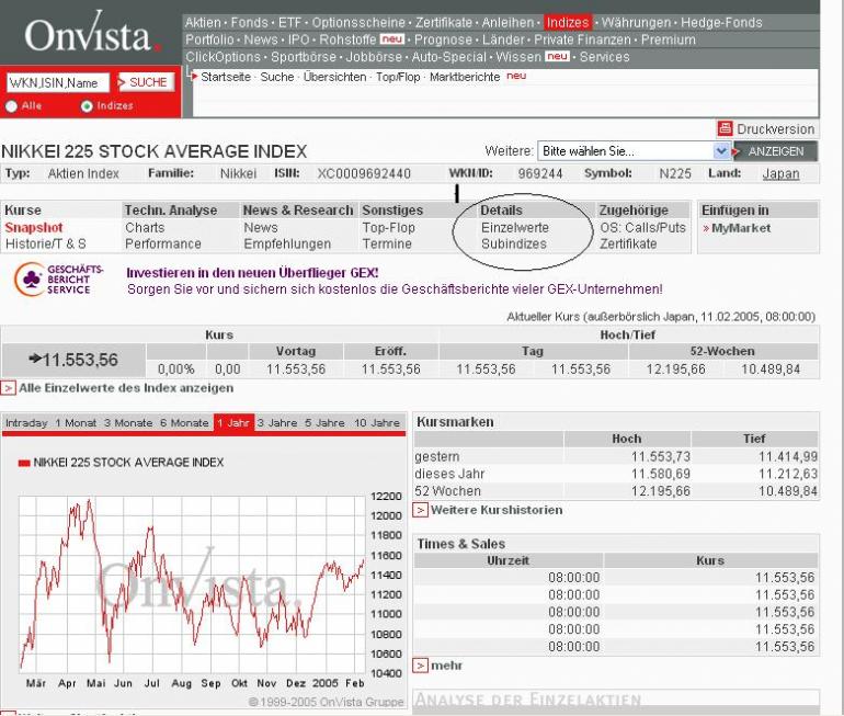 JimmyT Februar 11, 2005 @ desesperado Nicht schlecht! Vielleicht gibt es das bei onvista für jeden Index? Aber wie bist du zu den Einzelwerten für den NIKKEI gekommen? Wenn ich NIKKEI 225 in die Such-Funktion eingebe, spuckt er mir nur den Index aus? Gruß JimmyT Diesen Beitrag teilen Link zum Beitrag