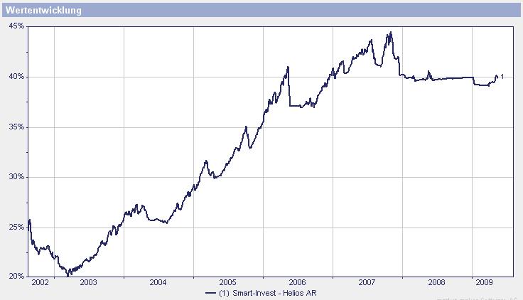 Sapine September 25, 2008 · bearbeitet September 25, 2008 von Sapine Eigentlich ist das wohl kein Mischfonds sondern ein Dachfonds. Anlageziel: Der HELIOS AR strebt als Anlageziel ein möglichsthohes Kapitalwachstum in Euro unter Berücksichtigung eines propietären trendfolgenden Handelsansatzes an. Hauptsächliche Grundlage der Investitionsentscheidung für ein bestimmtes Zielinvestment ist die Kursentwicklung dieser Anlage in der Vergangenheit. Gekauft wird, wenn aufgrund der Untersuchung des historischen Kursverlaufes mit Hilfe verschiedener Indikatoren steigende Kurse zu erwarten sind. Das kann antizyklisch nach Rückschlägen oder im Rahmen eines laufenden Aufwärtstrends der Fall sein. Quelle Kurzprospekt Anlagepolitik Für den HELIOS AR sollen vorwiegend Anteile anoffenen Aktien-, Renten-, Genussschein-, Wandelanleihen-, Devisen-, Geldmarktfonds sowie gemischten Fonds erworben werden. Unter anderem darf auch in Rohstofffonds investiert werden. Zudem bis zu 10 % auch in diverse andere Instrumente wie offene Immofonds, Hedgefonds, nicht börsennotierte Wertpapiere und Geldmarktinstrumente und auch Zertifikate. Neben der thesaurierenden Anteilklasse B gibt es auch eine ausschüttende Variante A WKN: A0F5LF ISIN: LU0227003679 Gebühren und Kosten: Ausgabeaufschlag 5,26 % Verwaltungsvergütung bis zu 1,25 % Erfolgshonorar: bis zu 20 % von der Performance die 4 % übersteigt Die enthaltenen Unterfonds dürfen selbst eine Verwaltungsgebühr von bis zu 2,5 % haben Zudem gibt es eine Betreuungsgebühr von bis zu 0,65 % vermutlich für die Depotbank Auch wenn mich die optische Aufbereitung der Fondsprospekte eher abschreckt, scheint die Strategie bisher ganz gut zu funktionieren. Diesen Beitrag teilen Link zum Beitrag