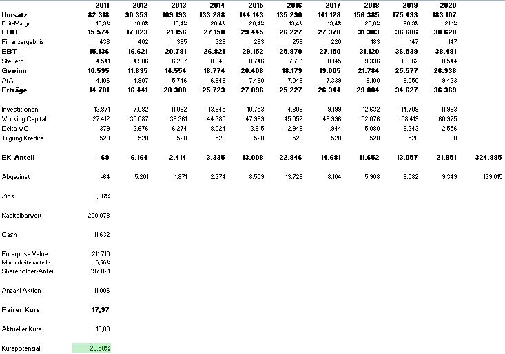 Stairway Mai 28, 2011 Servus Wave, immer wieder interessant zu lesen! Fair Value: Eine Anmerkung zum DCF. Du benutzt hier (wie ich i.d.R. auch) das Equity-Verfahren. Im Ergebnis erhältst du also den Equity-Value und nicht den Enterprise Value. Auf die 188.247 darfst du das Cash daher nicht draufrechnen, denn die positiven Zinserträge des Cashs sind bereits positiv in die GuV und damit in die Cashflows eingeflossen. (Es sei denn, du hast das jetzt extra oben in der GuV rausgelassen). Eine Hinzurechnung von (Net)Cash bzw. allgemein die Addition der Nettofinanzverbindlichkeiten darf nur im WACC-Verfahren durchgeführt werden. Anderst ist es, wenn das Unternehmen z.B. eine Immobilie hat, die keine Cashflows erzeugt. Die kann dann abschließend addiert werden, da diese verkauft werden kann, ohne die Cashflows zu berühren. Beste Grüße Diesen Beitrag teilen Link zum Beitrag