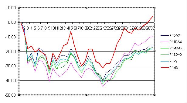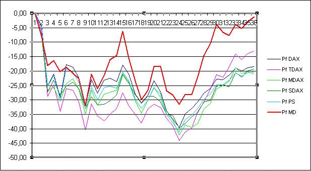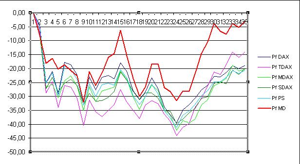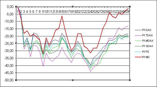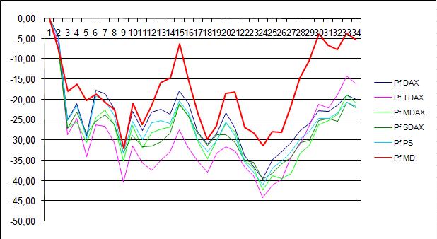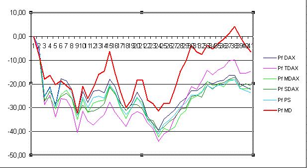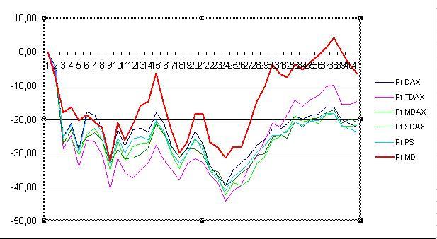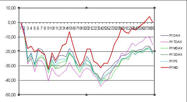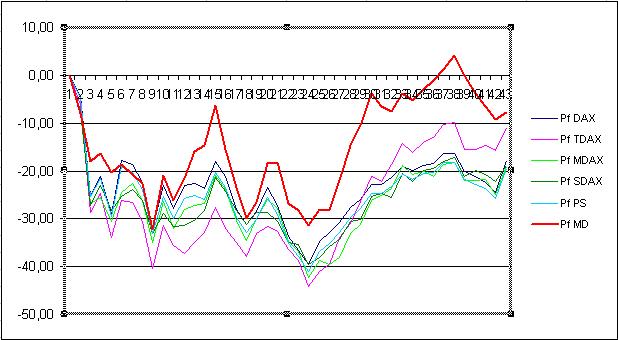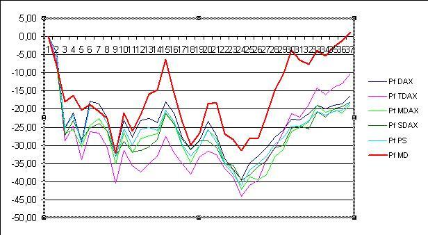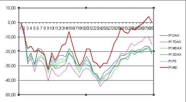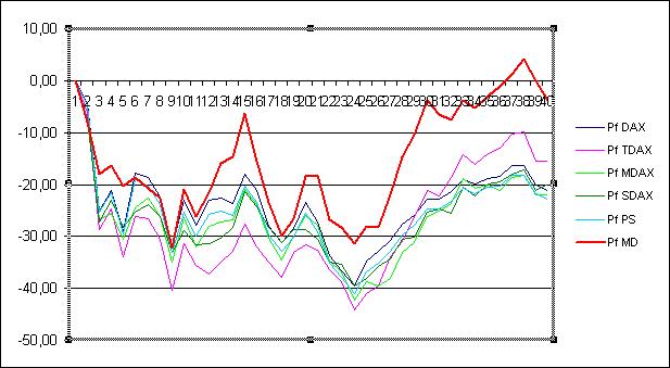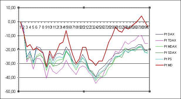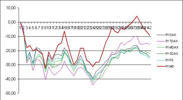 Wave XXL Juni 20, 2009 Empfindliche Verluste in dieser Woche - das Depot ist wieder minimal in den negativen Bereich geraten.....doch die anderen Indices haben in gleichem oder höheren Maße verloren - der Vorsprung auf den "hartnäckigsten Verfolger" (TecDAX) ist sogar weiter gewachsen. Diesen Beitrag teilen Link zum Beitrag