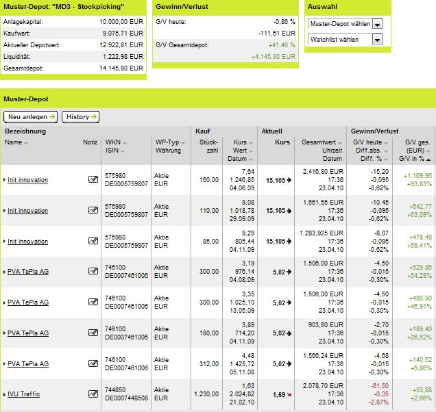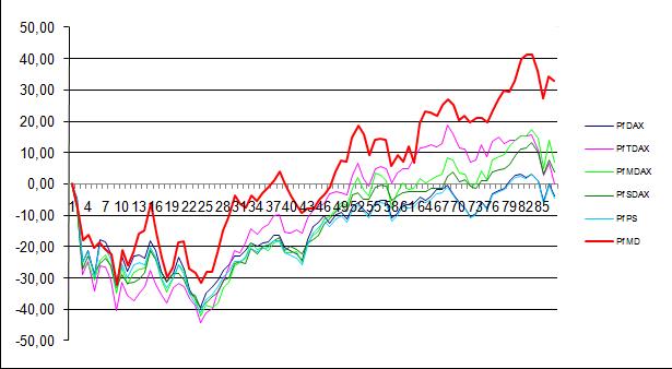 Wave XXL Mai 22, 2010 · bearbeitet Mai 22, 2010 von Wave XXL Das Depot hat diese Woche im Gegensatz zu den anderen Indices relativ wenig verloren. Der Vorsprung zum nächstbesten Index (MDAX) beträgt nun schon 26 %-Punkte und meiner Ansicht ist mit den aktuellen Werten noch ordentlich Luft nach oben Zudem habe ich so langsam wieder ein paar attraktive Titel in der Pipeline, die als mögliche Nachrücker in Frage kommen könnten Diesen Beitrag teilen Link zum Beitrag