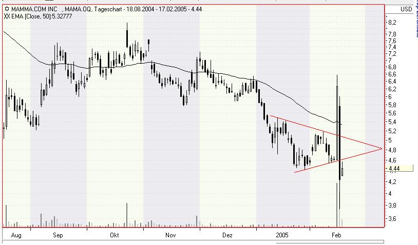 desesperado Februar 18, 2005 doch alles hat einen Grund: 15.02.2005 21:55:Mamma.com: Mysteriöser Kurssprung (Korr.) Die Titel von Mamma.com (Nachrichten) liegen an der Nasdaq derzeit 37,01 Prozent im Plus bei 6,33 Dollar. Im Handelsverlauf waren sie bis auf 6,57 Dollar nach oben gesprungen. Das Unternehmen hat sich auf die Wiedergewinnung von Informationen im Internet spezialisiert und ist Betreiber der Meta-Suchmaschine www.mamma.com. CEO Guy Faure legte heute dar, er sehe keinen Grund für den abrupten Kursanstieg der Aktie. Er sei sich keiner Nachrichten oder Neuigkeiten bewusst, die die Titel unvermittelt in solche Höhen treiben könnten. Am Markt machen derzeit aber offenbar Übernahmegerüchte die Runde. 16.02.2005 19:07:Mamma.com: Prüfer springt abDer Wirtschaftsprüfer PriceWaterhouseCoopers hat heute erklärt, dem Jahresabschluss 2004 von Mamma.com (Nachrichten) kein Bestätigungsvermerk zu erteilen. Der Suchmaschinenbetreiber meldete vor diesem Hintergrund, man sei nun nicht mehr in der Lage, die Prüfung zu beginnen, solange die informelle Untersuchung der Börsenaufsicht SEC wegen der jüngsten intensiven Kursbewegungen nicht abgeschlossen sei. Man befinde sich nun auf der Suche nach einem neuen Prüfer. Es sei unwahrscheinlich, dass man den Abschlussbericht bis zum 31. März vorlegen könne. Die Aktie von Mamma.com rutschte heute an der Nasdaq zunächst um 8,53 Prozent auf 5,74 Dollar ab und wurde anschließend vom Handel ausgesetzt. http://www.finanznachrichten.de/nachrichte...n/mamma-com.asp incl. TA vom Emittentenpusher wie lange wird es sie noch geben, die Mutter der Suchmaschinen :-" ui, PWC erteilt keinen Bestätigungsvermerk aufgrund dessen ist das Schicksal der Aktie bestimmt, ich werde sie beobachten :'( http://www.mamma.com/Mamma?query=mamma+com&qtype=4 Diesen Beitrag teilen Link zum Beitrag