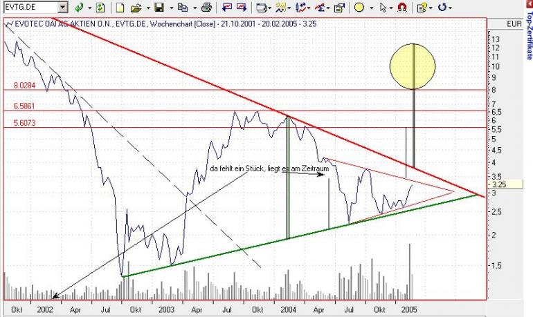 Denker Februar 20, 2005 Ach so, die rote Dreieckslinie ist in dem langfristigen Chart nicht relevant, aber für die jetzige Betrachung. Übrigens bin ich nicht investiert, kann nicht überall sein. Diesen Beitrag teilen Link zum Beitrag