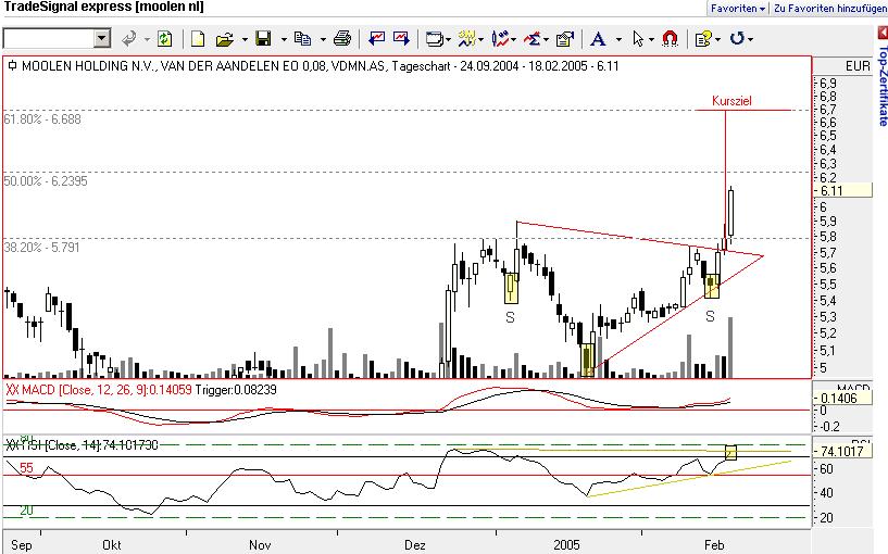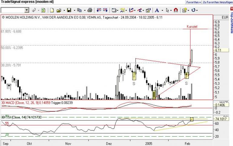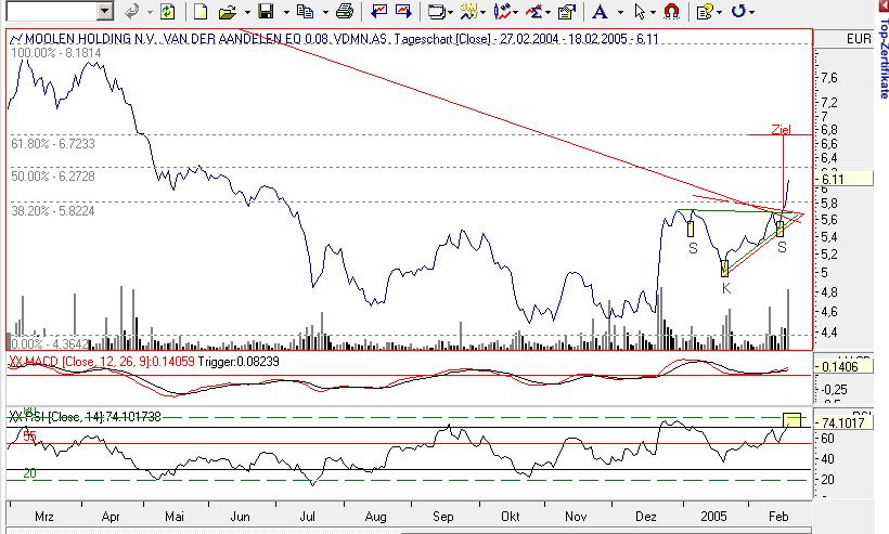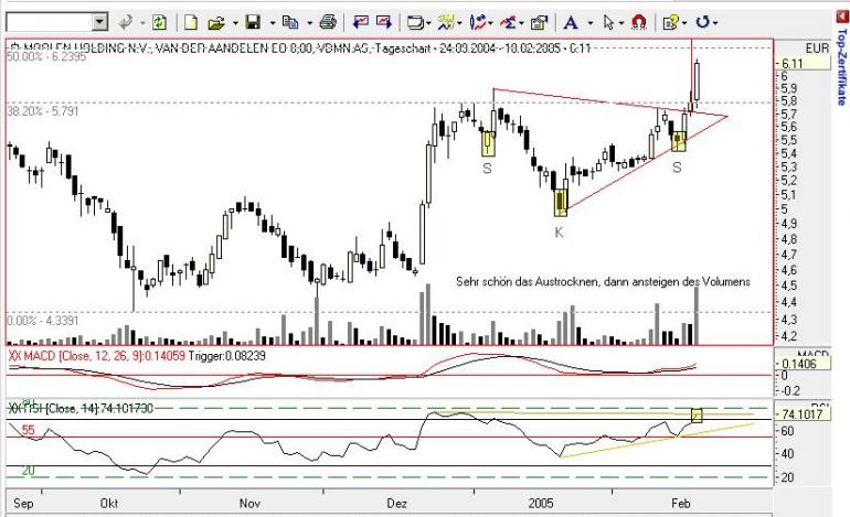 Denker Februar 20, 2005 So hier noch etwas Sonntagslektüre, dann geht es ab ins Bett, obergrins Dimka halt dich ran. Hier eine Dreiecksformation mit etwas Potenzial m. E. Einen langfristigen Chart kann ich leider nicht stellen. Mir wird nur ein 2 Jahreschart angeboten. Die rote Primärtrendlinie könnte in einem längerfristigen Chart noch evtl. anders gezeichnet werden, ist hier z. Zt. aber nicht relevant. Es ist die Moolen aus NL Diesen Beitrag teilen Link zum Beitrag