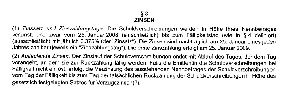 John Silver November 29, 2009 Hallo! Ich habe eben meine Abrechnung (Comdirect) für die Anleihe angesehen. Da steht: "Zinsperiode: 25.01.2009 - 24.01.2010" Da bin ich doch einwenig unruhig geworden, jedenfalls so wie ich den Satz verstehe. Bin darauf diesen Thread nochmal durchgegangen, konnte leider dazu aber nichts finden. Im Prospekt steht jedenfalls auf S. 14 im §3 Zinsen : Ich gehe also davon aus, dass der Zins dieser Anleihe "normal" gezahlt wird und die Comdirect in ihrer Abrechnung einen "fehlerhaften"/ungenauen Hinweis gemacht hat. Oder kann mir hier jemand was dazu sagen? Diesen Beitrag teilen Link zum Beitrag