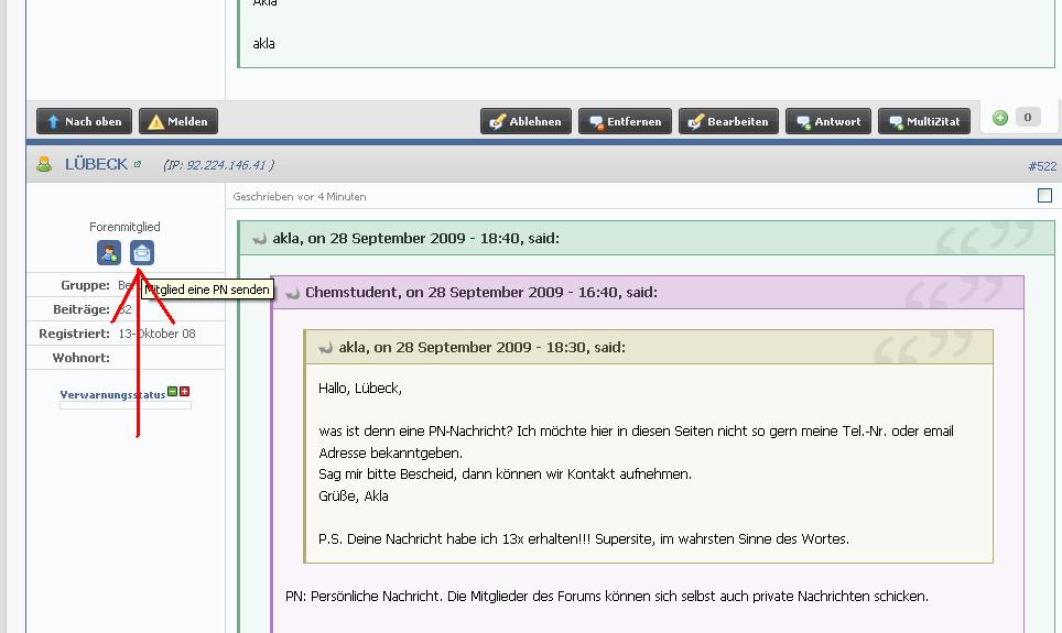 LÜBECK September 28, 2009 Unter dem Avatar bzw. Niickname eines User findet ihr ein Symbol das wie ein Briefumschlag aussieht. Einfach dort draufklicken, und schon könnt ihr dem User eine Nachricht schicken. (siehe Bild) Für vollen zugriff auf den nachrichtendienst: Ganz oben Rechts im Forum findet ihr euren Username. Wenn ihr dort draufklickt, erscheint ein Menü. Dort auf "nachrichtendienst" klicken. Anschließend findet ihr alle Nachrichten und könnt auch neue schreiben. Als Hinweis: Das Nachrichtensystem wurde überarbeitet. Neue private Diskussionen werden nun ähnlich wie ein Thread behandelt. Dies sorgt für eine verbesserte Übersichtlichkeit. danke für den Hinweis, aber warum befindet sich unter dem Nicknamen Lübeck nicht entsprechendes Symbol????????? Diesen Beitrag teilen Link zum Beitrag