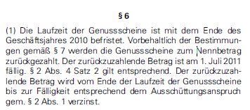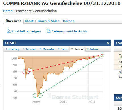 vanity Juli 1, 2011 Und da fällt mein Blick doch auf einen Genussschein der Commerzbank DE0008032053 ... Der Kurs des Genusscheins ist derzeit bei 80/86, was einer schönen Rendite bis 2010 entsprechen würde. Hab ich was übersehen, oder ist das Chance-Risikoverhältnis jetzt nach der Quais-Verstaatlichung tatsächlich attraktiv? Wenn Hartmut damals zugegriffen hätte (vielleicht verrät er uns noch, ob er's gemacht hat), wäre das im Nachhinein betrachtet ein schönes Investment mit über 10% p. a. gewesen. Freilich hätte das Papier im Frühjahr 2009 einiges an Nerven gekostet - wer sich zu diesem Zeitpunkt getraut hat, konnte 50% p. a. auf's eingesetzte Kapital generieren. Heute verabschieden wir uns mit Wehmut von dem Papier, nicht ohne den Verlauf noch dokumentiert zu haben Die ausgefallenen Kupons 2009 und 2010 lassen sich entbehren, schmerzhafter ist, dass die COBA jetzt ohne echte Genussscheine dasteht. Aber vielleicht geling es ihr noch, sich die Deutsche Fischbank einzuverleiben, damit DSF7 (2011) und DSF1, DSF4 (2020) die Lücke ausfüllen können. Bis dahin müssen wir mit dem Bastard UT2A vorlieb nehmen. Diesen Beitrag teilen Link zum Beitrag
