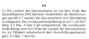 Prospektständer Juli 2, 2010 · bearbeitet Juli 2, 2010 von jschoeck Die Frankfurter Sparkasse hat jedenfalls meinen Informationen zu Folge keine Ausschüttung überwiesen... über den Ausfall der Ausschüttungen auf die Genussscheine für das Geschäftsjahr 2009 Für das Geschäftsjahr 2009 erfolgen auf die – € 150 000 000,– Genussscheine von 1999/2009 (WKN 816 406 / ISIN DE0008164062) – € 100 000 000,– Genussscheine von 1999/2009 (WKN 816 407 / ISIN DE0008164070) – € 320 000 000,– Genussscheine von 2000/2010 (WKN 803 205 / ISIN DE0008032053) keine Ausschüttungen. Der Rückzahlungsanspruch jedes Genussscheininhabers vermindert sich dadurch jedoch nicht. Frankfurt am Main, im Mai 2010 Quelle eBundesanzeiger Edit: Vanity ich krieg heut noch ein Anfall, immer bist du schneller... :- Diesen Beitrag teilen Link zum Beitrag