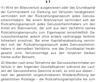 H.B. Oktober 16, 2008 Hi, da jetzt ja bei Pfandbriefen nicht mehr so viel zu holen ist, schaue ich mich gerade links und rechts um. Und da fällt mein Blick doch auf einen Genussschein der Commerzbank DE0008032053 ( Link zu den Genussscheinbedingungen ) Heikel ist die Verwässerung der Ausschüttung bei einem Bilanzverlust: Wenn ich mir die Zahlen der Citigroup und der SocGen anschaue, dann ist die Wahrscheinlichkeit auf einen kleinen Bilanzgewinn auch bei der CBK nicht so klein. Der Kurs des Genusscheins ist derzeit bei 80/86, was einer schönen Rendite bis 2010 entsprechen würde. Hab ich was übersehen, oder ist das Chance-Risikoverhältnis jetzt nach der Quais-Verstaatlichung tatsächlich attraktiv? Diesen Beitrag teilen Link zum Beitrag