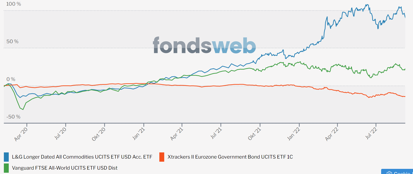 Wenn man sich mal die drei Hauptbausteine des Arero ansieht, dann hätte man spätestens im Sommer 2021 aus den Anleihen raus gehen müssen. Gleichzeitig war das ziemlich genau der Zeitpunkt, an dem die Rohstoff-Futures anfingen, durch die Decke zu gehen. Aber schon davor (Zeit um den Corona-Crash) war es so, dass die Anleihen kaum mehr Rendite abwarfen, gleichzeitig aber die Rohstoffe anfingen, ihre sehr lange Durststrecke zu beenden.