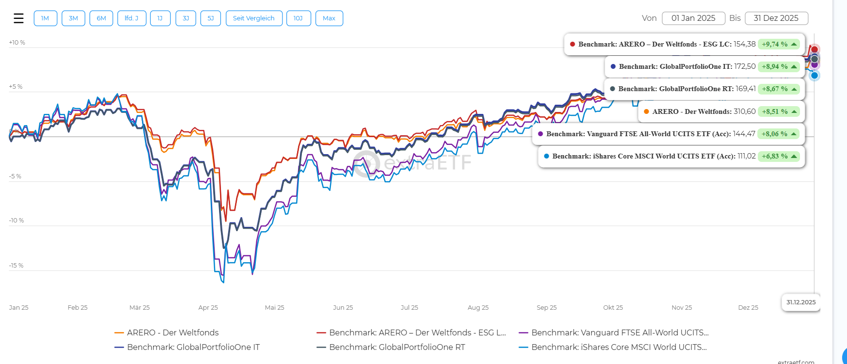 Puppi 15. Januar vor 10 Stunden von Bigwigster: ARERO esg sogar +9,7% für 2025. Wahrscheinlich ausschlaggebend dass durch commodities ex. Agri ein höheres Edelmetallgewicht geholfen hat. (ARERO normal 8,5%, quelle bei beidem Onvista) Irgendwie war ich eh schon skeptisch bzgl. der fondsweb-Daten...nach deinem Post noch mehr. Habe jetzt mal bei extraETF nachgesehen und NAV-Kurse für 2025 verglichen. Da sieht es dann wie folgt aus bzw. es bestätigt deinen Daten von onvista: Diesen Beitrag teilen Link zum Beitrag