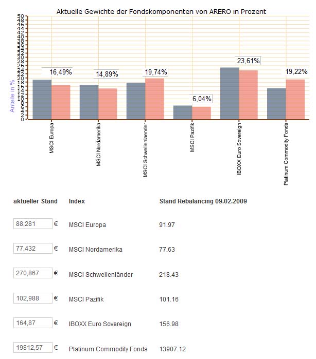 Geldspeicher Januar 1, 2010 Wenn ich mir folgende Seite anschaue und die entsprechenden Daten eingebe, dann ist die Abweichung zum letzten Rebalancing Termin recht unterschiedlich. Welche Schlussfolgerung kann man aus diesen Daten rauslesen? Arero Ich denke du kannst an der Grafik gut sehen, welche Assets besser gelaufen sind als andere. Die blauen Balken geben die angestrebte Asset-Verteilung an, rot ist die momentane tatsächliche Assetverteilung. Oder was genau willst du wissen? Diesen Beitrag teilen Link zum Beitrag