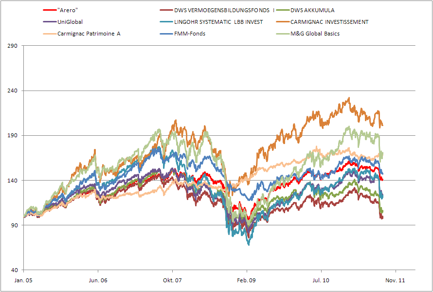 Chemstudent August 28, 2011 · bearbeitet August 28, 2011 von Chemstudent Wie immer nach 2 Monaten ein Update. Zur Erklärung: Für alle die es noch nicht kennen: Die Daten vor dem 21.10.2008 basieren auf einer "Nachbildung", deren Konstruktion ich hier beschrieben habe. Die Nachbildungsdaten sind hier selbstverständlich mit Kosten berechnet. Ab dem 21.10.2008 wurden die realen Daten des Arero-Fonds genommen. (Sobald die neue Rohstoffkomponente drin ist, erfolgt also eine "automatische" übernahme) Normiert auf 30.06.2000 = 100 Punkte [...] Der ARERO ist zur besseren Übersichtlichkeit in allen Charts knallrot gezeichnet. Bitte immer die Legende beachten, da die Farbgebung der anderen Fonds in den Charts variiert. Als Hinweis für den M&G Global Basic im Langfristvergleich bitte ich diesen Post zu beachten. Diesen Beitrag teilen Link zum Beitrag