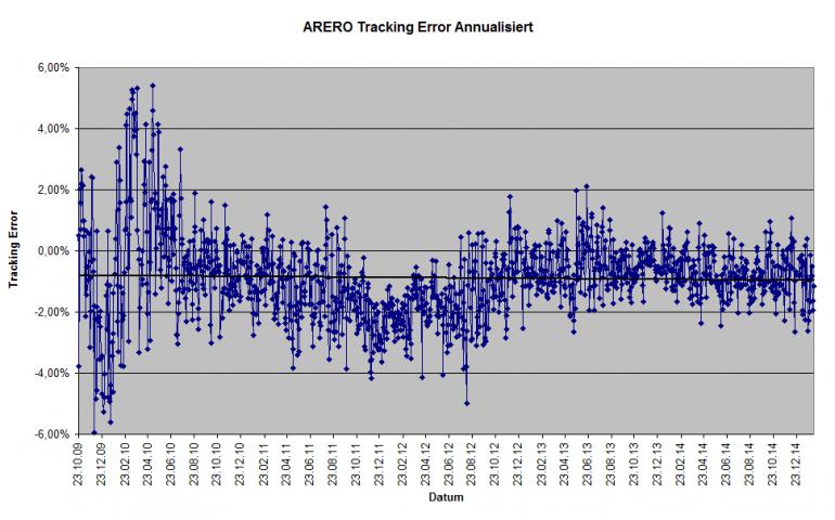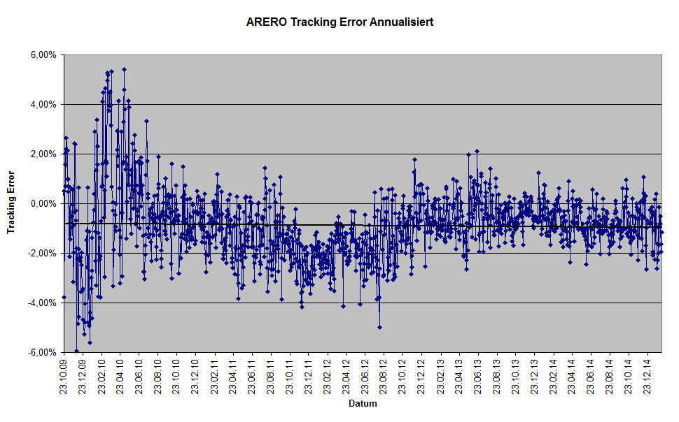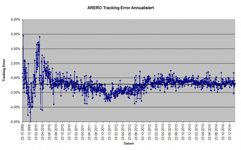 sparfux Februar 11, 2015 2011-2015: 138,54->173,34 (+25,1%=5,76%p.a.) zu 137,52->176,16 (+28,1%=6,38%p.a.) D.h. der ARERO liegt in den letzten 4 Jahren 0,62% p.a. hinter dem ARERO-Index-0,5%. D.h. ich habe mich verrechnet. Die Differenz zwischen ARERO und ARERO-Index beträgt 1,1% (zu Ungunsten des ARERO) Jetzt habe ich mir die Tabelle mal selber vor geknöpft und den annualisierten Trackingerror (täglich rollierend) gegenüber dem ARERO Index (ohne Kosten) berechnet. Hier das Ergebnis: Der Mittelwert von Anfang an beträgt hier -0,88% p.a., der Mittelwert seit 2.1.13 (gut 2 Jahre) -0,64% p.a. Diesen Beitrag teilen Link zum Beitrag