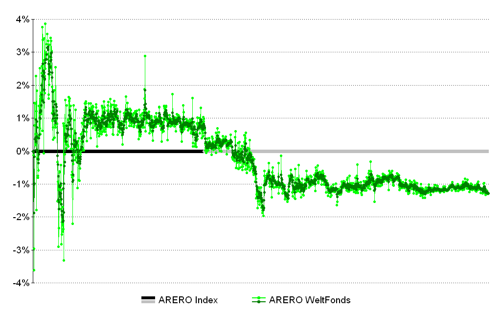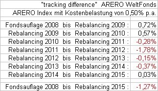 etherial Februar 11, 2015 Der Mittelwert von Anfang an beträgt hier -0,88% p.a., der Mittelwert seit 2.1.13 (gut 2 Jahre) -0,64% p.a. Mit dem Schaubild kann ich mich anfreunden. Die Zahlen sind bei mir etwas anders (diesmal seit Jahresbeginn, nicht seit Rebalancingtermin): - 2009-2015: Auf -0,82% - 2013-2015: Auf -0,72% - 2011-2015: auf -1,14% (ergänzt von mir) Ich gehe davon aus, dass die Differenzen durch Zeilenspringer (abseits vergleicht Index und Fonds um eine Zeile versetzt, ich nicht) oder andere Art der Annualisierung (arithmetisches Mittel der annualisierten Werte, oder geometrisches Mittel des kumulativen Ergebnisses) entstehen. Ich gehe aber davon aus, dass du mit anderer Berechnungsmethodik vielleicht ein genaueres aber nicht widersprüchliches Ergebnis für den ergänzten Zeitraum bekommst. Unstrittig ist, dass der ARERO (ohne Kosten) im letzten Jahr seinen Index fast punktgenau getrackt hat (sogar mit geringer Overperformance). In den übrigen Jahren ist das Tracking eher bescheiden. Diesen Beitrag teilen Link zum Beitrag