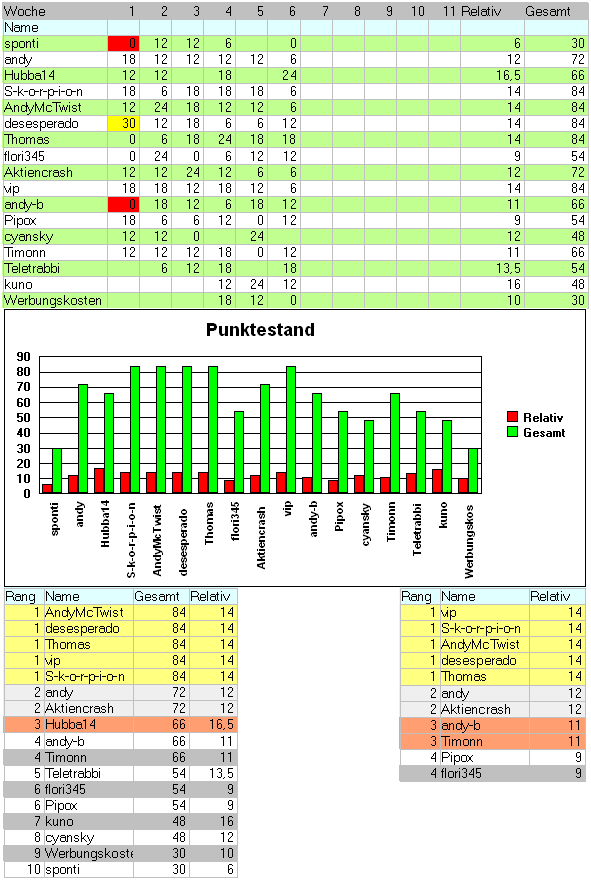 Aktiencrash März 12, 2005 Hier das Endergebnis der 6. Runde. Stand zum Wochenbeginn: 1. DAX 4.423,52 2. NASDAQ Composite 2.070,61 3. Nikkei 225 11.873,05 4. Brent Crude Oil 51,60 5. Gold 434,40 6. Platin 872,00 Stand zum Wochenende: 1. DAX 4.360,49 2. NASDAQ Composite 2.041,60 3. Nikkei 225 11.923,89 4. Brent Crude Oil 52,70 5. Gold 445,80 6. Platin 871,00 Folgende Tipabgabe war richtig: 1 - 2 - 3 + 4 + 5 + 6 - Der Wochensieger ist Hubba14 mit 24 Punkte Die Gesamtwertung führen S-k-o-r-p-i-o-n; vip; AndyMcTwist; Thomas; desesperado mit je 84 Punkte an Die relative Wertung führen S-k-o-r-p-i-o-n; vip; AndyMcTwist; Thomas; desesperado mit je 14 Punkte an Jeder sollte seine Punktestand überprüfen ! Bei Reklamationsgründen nehmt einen Anwalt und verklagt Aktiencrash auf Richtigstellung der Ergebnisse :'( ! +5 Punkte für jeden richtigen Tip -1 Punkt für jeden falschen Tip Es dürfen jederzeit neue Mitspieler einsteigen. Grafik: *Punktetabelle *Punkte gesamt (als Grafik) *Zwischenstand sortiert (ausschlagebend bei Punktegleichstand ist die relative Wertung Diesen Beitrag teilen Link zum Beitrag