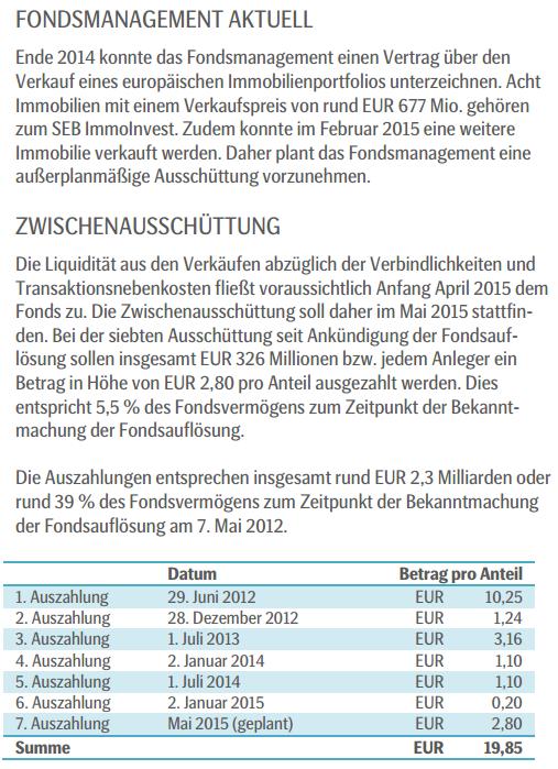 ghost_69 März 20, 2015 · bearbeitet März 20, 2015 von ghost_69 Fondskommentar SEB ImmoInvest März 2015Sehr geehrte Damen und Herren, Ende 2014 konnte das Fondsmanagement einen Vertrag über den Verkauf eines europäischen Immobilienportfolios unterzeichnen. Acht Immobilien mit einem Verkaufspreis von rund EUR 677 Mio. gehören zum SEB ImmoInvest. Zudem konnte im Februar 2015 eine weitere Immobilie verkauft werden. Daher plant das Fondsmanagement eine außerplanmäßige Ausschüttung vorzunehmen. aus dem Newsletter. Das ist mal eine gute Nachricht. Fondskommentar_ImmoInvest_Maerz_2015.pdf Ghost_69 :- Diesen Beitrag teilen Link zum Beitrag