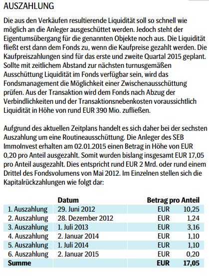 ghost_69 Januar 9, 2016 Anteilspreisreduzierung am 05.01.2016 Der am 5. Januar 2016 veröffentlichte Anteilwert des SEB ImmoInvest sinkt um 36 Cent von 29,17 EUR auf 28,81 EUR. Hintergrund für die Anteilwertänderung ist der Verkauf des Potsdamer Platzes zum 1. Januar 2016 und die damit zusammenhängenden Effekte. Für weitere Informationen verweisen wir auf unseren letzten Fondskommentar. Verzögerung der Ausschüttung im Januar 2016 Die nächste Ausschüttung des SEB ImmoInvest war für Anfang Januar 2016 angekündigt, dieser Termin wird auf voraussichtlich Ende Januar 2016 verschoben. Das Closing und damit auch die Kaufpreiszahlung aus dem Verkauf des Potsdamer Platz Ensemble ist derzeit für den 31.12.2015 geplant. Erst nach Gutschrift der Kaufpreiszahlung auf den Konten des Fonds kann die Prüfung der steuerlichen Daten nach § 5 InvStG beginnen. Mit der Verschiebung der Ausschüttung können Liquidität sowie die steuerlichen Daten aus dem Verkauf des Potsdamer Platzes berücksichtigt werden. Über den konkreten Ausschüttungstermin und die Höhe der Ausschüttung werden wir Sie vorab im nächsten Fondskommentar im Verlauf des Januars informieren. von der Homepage Ghost_69 :- Diesen Beitrag teilen Link zum Beitrag