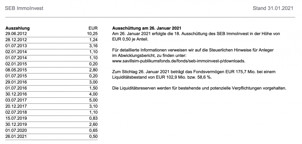 ghost_69 Juni 30, 2019 Zitat Anteil aus und verkauft Objekt in USA 04.06.2019 SEB ImmoInvest P News Im Rahmen der regelmäßigen halbjährlichen Auszahlungen werden am 15. Juli 2019 EUR 0,83 pro Anteil an die Anleger ausgeschüttet. Dies entspricht einer Summe von insgesamt rund EUR 96,7 Millionen. Mit der 15. Ausschüttung seit Bekanntmachung der Fondsauflösung summiert sich der während der Abwicklungsperiode ausgezahlte Betrag auf insgesamt EUR 4,5 Milliarden bzw. rund 75% des Fondsvermögens bei Kündigung des Verwaltungsmandates im Mai 2012. Die Auszahlung repräsentiert die Endausschüttung für das Geschäftsjahr 2018/19, in deren Rahmen die frei verfügbare Liquidität an die Anleger ausgekehrt wird. Die Liquidität stammt aus den drei Verkäufen von zwei Objekten in Italien sowie einer Immobilie in Deutschland, die Ende 2018/ Anfang 2019 veräußert werden konnten. Weitere Liquidität stammt aus einem aktuellen Verkauf: Das Fondsmanagement konnte im Mai 2019 ein Objekt in den USA veräußern. Das Bürogebäude in Wayne im Bundesstaat Pennsylvania im Großraum von Philadelphia wurde 2006 für den Fonds erworben. Der Verkauf erfolgte unterhalb des zuletzt festgestellten Verkehrswerts und hat somit einen negativen Effekt auf den Anteilwert. Die Mittel aus dem Verkauf fließen dem Sondervermögen erst einige Zeit nach Abschluss der Transaktion zu, sodass der Ausschüttungstermin entsprechend angepasst wurde. Die jeweilige depotführende Stelle wird zur Bearbeitung der Auszahlung Zeit benötigen, sodass der Auszahlungsbetrag erst einige Bankarbeitstage nach dem 15. Juli 2019 gutgeschrieben wird. Die Auszahlung hat einen rechnerischen Effekt auf den Anteilwert des Fonds in Höhe des ausgeschütteten Betrages. Weitere Ausschüttungen können vorgenommen werden, sobald weitere Immobilien aus dem Bestand des SEB ImmoInvest veräußert werden und Risiken aus den erfolgten Verkäufen sich mit der Zeit verringern, sodass Liquiditätsrücklagen aufgelöst werden können. Diese Liquiditätsrücklagen muss die Depotbank für eventuelle Nachforderungen der Steuerbehörden, Gewährleistungs- und Garantieverpflichtungen vorhalten. Derzeit hält der SEB ImmoInvest noch 10 Objekte in Deutschland und den USA, die sich alle im Vermarktungsprozess befinden. Über erfolgte Verkäufe werden die Anleger wie bisher entsprechend informiert. Den Zeitpunkt und die Höhe der Ausschüttungen bestimmt die Depotbank. https://www.savillsim-publikumsfonds.de/de/fonds/seb-immoinvest/news/news-detail/seb-immoinvest-schuettet-am-15-juli-2019-eur-083-pro-anteil-aus-und-verkauft-objekt-in-usa/ 20190604_Ausschuettung_SEB-ImmoInvest.pdf Ghost_69 Diesen Beitrag teilen Link zum Beitrag