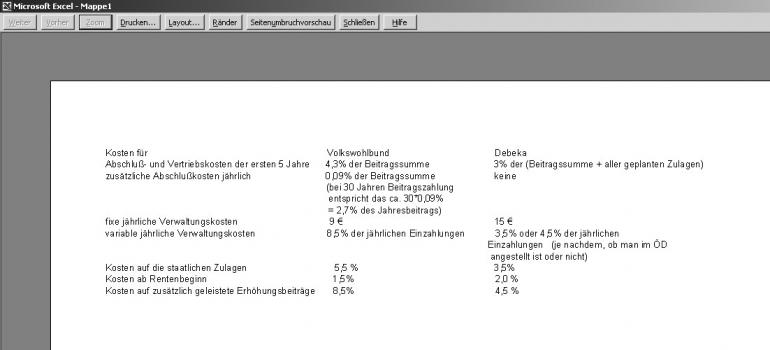 Granini Dezember 23, 2008 So, alle Kosten bei einer klassischen Rentenversicherung beim Volkswohlbund stehen ja eingescannt hier im Thread. Zum Abschluß stelle ich jetzt mal als Vergleich dazu die Kosten bei einer klassischen Rentenversicherung bei der Debeka hier rein, siehe Anlage: Super, danke für die Übersicht! Jetzt fehlen nur noch alle anderen Riester-Anbieter, dann haben wir einen Super-Vergleich! Diesen Beitrag teilen Link zum Beitrag