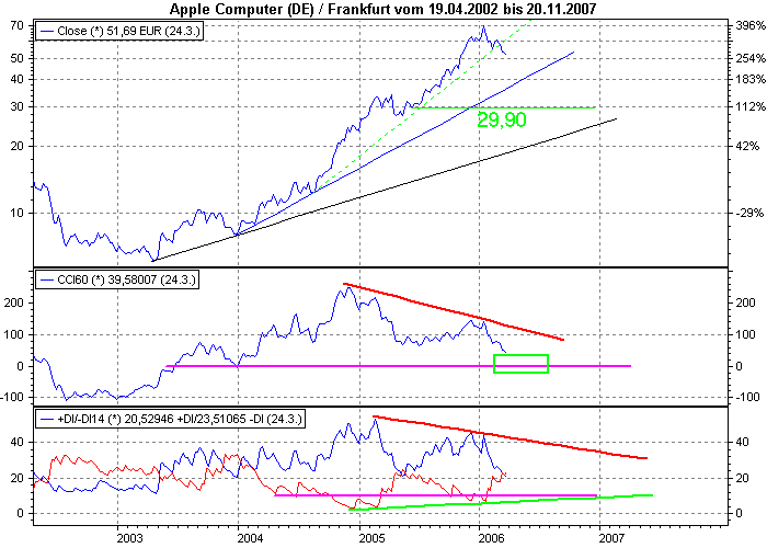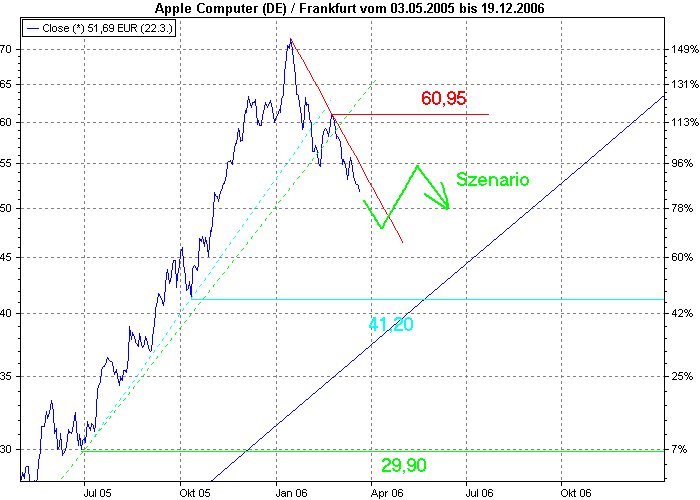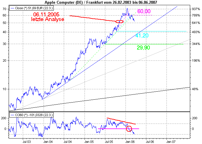 Nach dem Durchbruch der 60 Marke, liegt die nächste horiz. Unterstützung wie schon am 06.11.05 geschrieben bei 41,20 . Ein Fall der Aktie bis dort hin wäre noch kein Beinbruch. Die 2003 bestehende Hausse wäre immer noch intakt.