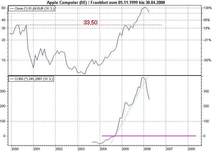 Sollte der CCI auf Wochenbasis signifikant unter die neutrale Linie fallen, spricht das ganze für eine längere Konsolidierungsphase (eventuell symmetrisches Dreieck). Langfristig sehe ich die Hausse für die Apple Aktie als intakt an. Daher rechne ich noch mal mit einem neuen Allzeithoch für die Aktie.