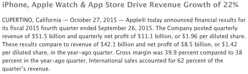 Toni Oktober 28, 2015 · bearbeitet Oktober 28, 2015 von Toni Quartalszahlen: iPhone spült Apple Milliarden in die Kasse Höher, schneller, Apple Und für die, die es ganz genau wissen wollen: Apple's (AAPL) CEO Timothy Cook on Q4 2015 Results - Earnings Call Transcript Diesen Beitrag teilen Link zum Beitrag
