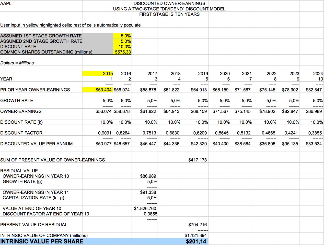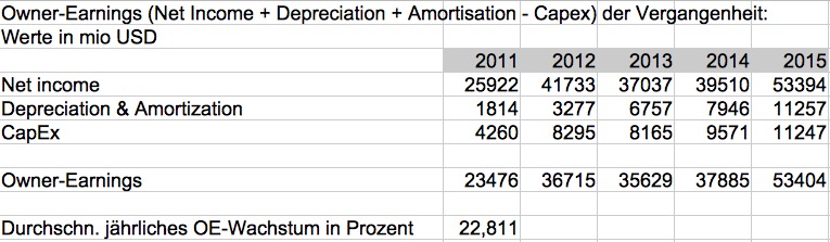 Toni Juli 12, 2016 · bearbeitet Juli 12, 2016 von Toni Da ja kaum noch jemand etwas zu Apple schreibt, denke ich, dass die Aktie langsam interessant wird... DCF-Bewertung nach Methode Discounted Owner Earnings: Benutzt wird hier das Excel-Sheet des Buchs The Warren Buffett Way von Robert G. Hagström: Zunächst habe ich das Wachstum der sog. Owner Earnings der letzten 5 Jahre berechnet: 22,8% Für die eigentliche Aktienwertberechnung nehme ich sehr konservative Wachstumswerte an: Ich nehme für die erste Phase an, dass nur die Hälfte des bisherigen Wachstums weiterhin gehalten werden kann: 11%. In der zweiten Phase nehme ich davon wiederum nur die Hälfte an: 5%. Wir kommen auf einen Aktienwert von ca. 321 USD, was eine Sicherheitsmarge von ca. 230% bedeutet, da der aktuelle Kurs bei ca. 97 USD liegt. Die Aktie erscheint nach dieser DCF-Bewertung also unglaublich günstig! Selbst wenn ich für beide Phasen nur 5% (= normales Wirtschaftswachstum) annehme, komme ich auf einen Aktienwert von 201 USD, also immer noch 100% Sicherheitsmarge! Fazit: Auch wenn Apple für alle Zukunft nur ein kleines Wachstum hinlegt, welches gerade mal dem normalen Wirtschaftswachstum entspricht, hat die Aktie ordentliches Potential. Aber mir scheint, dass selbst solch niedrige Wachstumsraten dem Unternehmen nicht mehr zugetraut werden.... Diesen Beitrag teilen Link zum Beitrag
