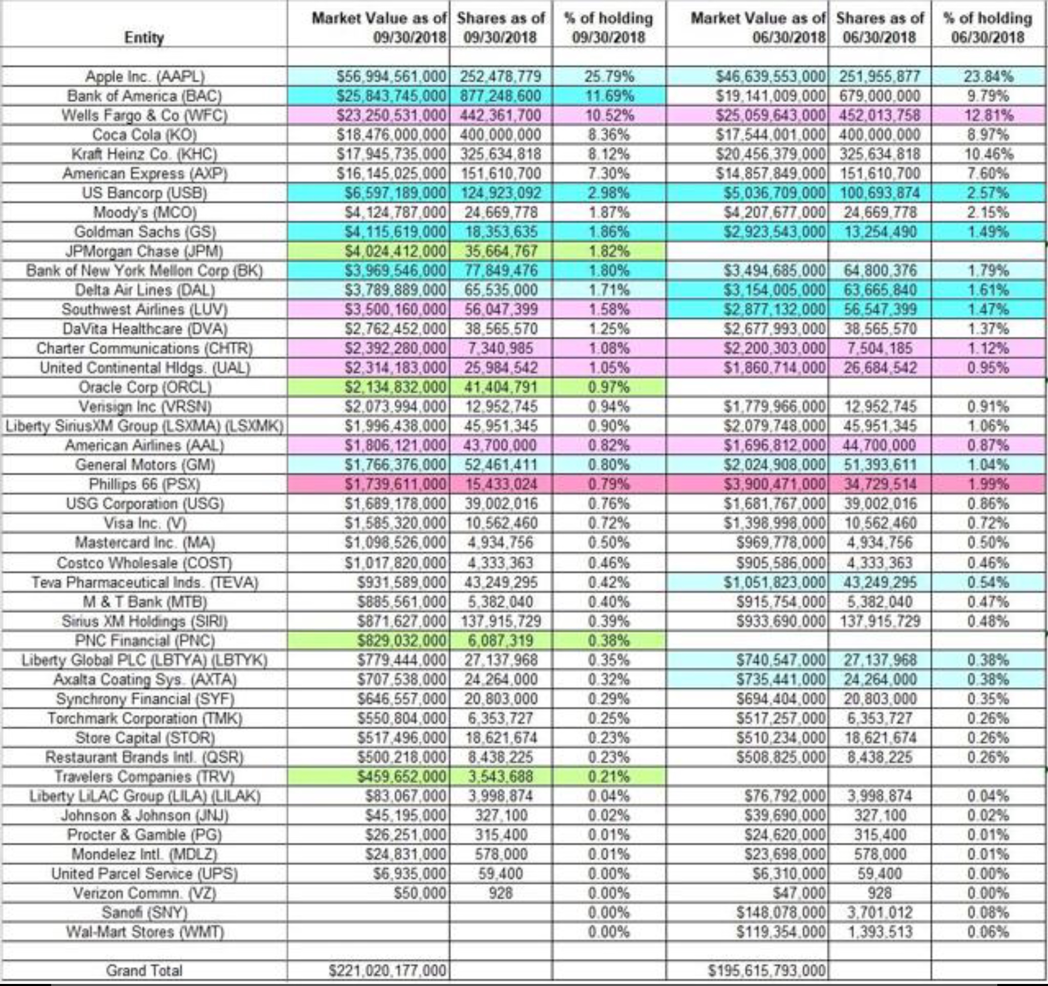 Toni November 22, 2018 · bearbeitet November 22, 2018 von Toni vor 35 Minuten schrieb Schildkröte: Quelle? marketscreener gibt 5,23% an Ich meine damit, daß Berkshire 24% seines Kapitals in Apple investiert hat: Wenn das nichts heißt... vor 34 Minuten schrieb silentbob: Dann können wir doch einfach die Aktien kaufen in denen Buffet und seine Firma investiert sind. Scheint ja sehr sicher zu sein für langfristige Investitionen. Wenn Du jeweils zum gleichen Zeitpunkt kaufst, ist das eine gute Idee. Oder du kaufst gleich die Berkshire-Aktie, am besten immer dann, wenn Buffett Aktienrückkäufe macht, denn dann hält er die Aktie für günstig. Und das ist zur Zeit so. Diesen Beitrag teilen Link zum Beitrag