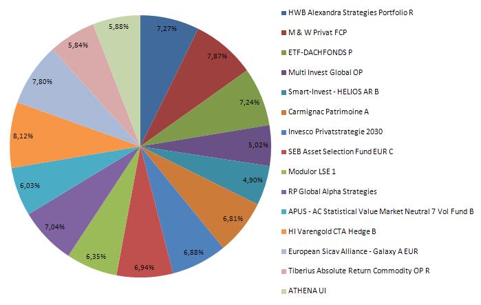 AbsoluteReturner Januar 11, 2009 Hier noch wie im alten Jahr angekündigt meine Fonds-Aufteilung nach dem Finetuning zum Jahresende mit Stichtag 31.12.2008. Ich habe das auch mal wie Dagobert mit Excel grafisch aufgearbeitet: Zu dem von Muesli erwähnten Handelsblatt-Artikel: Es soll nicht unerwähnt bleiben, dass dort bemerkt wurde, dass die 2008 sehr gut gelaufenen ManagedFutures-Strategien in geänderten Marktumfeldern durchaus wieder Probleme bekommen kann. Deshalb habe ich auch anstatt der 2008 sehr erfolgreichen Superfund-Produkte den Varengold CTA Hedge und den ESA Galaxy ausgewählt. Ich traue diesen beiden Produkten eher zu, in zukünftigen Seitwärts-Phasen besser abzuschneiden als andere dem Varengold wegen der beigemischten Kurzfrist-CTA-Strategien (wie im Handelsblatt-Beitrag am Ende bemerkt) und dem Galaxy vor allem wegen dem zu 50% enthaltenen Winton-Anteil. Die Winton-Strategie ist in der Vergangenheit mit wechselnden Trends bzw. trendlosen Phasen besser zurecht gekommen ist als andere CTA-Strategien. Auch die 2008 neu aufgelegten Produkte (z.B. Superfund Absolute Return, Quant Managed Futures) müssen erst mal ihre Qualität unter Beweis stellen. Diesen Beitrag teilen Link zum Beitrag