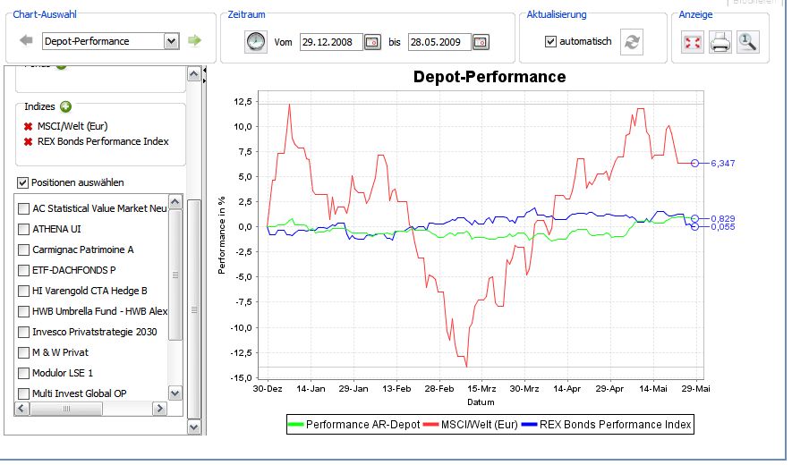etherial Dezember 31, 2008 Selbstverständlich kann für ein Fondsdepot mit dem Etikett Absolute-Return-Anspruch nicht ein MSCI World als Benchmark herangezogen werden. Wenn überhaupt eine Benchmark relevant wäre, dann nur ein Hedgefonds-Index, welcher selbst auf Absolute-Return-Strategien basiert, aber dies bietet fondsweb leider nicht mit an. Das stimmt nicht ... Wer Absolute Return wünscht, wünscht sich nicht besser als alle Hedgefonds zu sein. Er wünscht sich besser als alle anderen zu sein. Konsequenterweise müsste er sich also mit einem Index mit der optimalen Asset-Allocation messen. Hätte es damals schon einen ARERO gegeben, so wäre der sicher akkurat für den Vergleich. Der ursprüngliche Einwand war aber, dass wir bei unserer Fondsauswahl nur auf die Krisengewinner 2008 gesetzt haben, und es wurde uns prophezeit, dass diese Fonds in anderen Marktphasen sang- und klanglos untergehen werden. Ich hab die Kritik von Otto gar nicht so speziell aufgefasst ... Aber wie du aus deinen Charts dauerhafte Stabilität herausliest, ist mir schleierhaft. Da sind einige, die offensichtlich einfach nur Renten halten. Und andere die einfach nur durch die Auswahl des Zeitfensters anständig aussehen. Nimm dir den "Tiberius Absolute Return Commodity": Wenn du statt dem 1-Jahres-Zeitraum, den 6-Monate-Zeitraum nimmst, ist er plötzlich unter dem Euribor. Das was du hier betrieben hast ist alle Fonds aufgezählt, die einmal gut gelaufen sind. Die sind ab diesem Zeitpunkt immer über dem Benchmark, selbst wenn die Gewinne eher bescheiden sind. Allein deshalb weil sie früher mal einen Vorsprung erwirtschaftet haben. Dieser Vorsprung bringt keinem Anleger etwas, aber jeder denkt, dass der Fonds auch jetzt noch besser ist. Diesen Beitrag teilen Link zum Beitrag