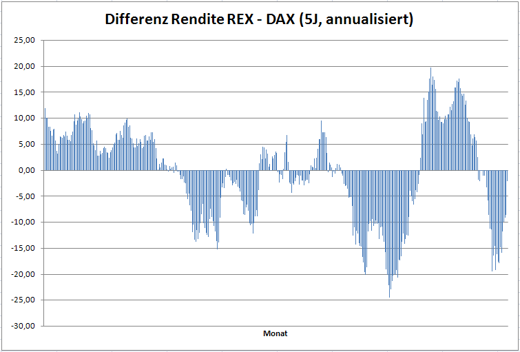 Norbert-54 November 16, 2008 Noch ein kleiner Nachtrag zu den Anmerkungen, dass der Zeitpunkt eines Einstiges in den REX bzw. in den DAX eine Rolle spielt. Dazu eine kleine Modellrechnung: - Monatliche Investition in beide ab 31. Januar 1970, Realisierung der Erträge nach jeweils 5 Jahren. - Berechnung der annualisierten Rendite nach jeweils 5 Jahren, monatlich rollierend - Bildung der Differenz der Renditen REX - Dax, monatlich Dazu die Graphik dieser Differenzen, monatlich von 31. Januar 1975 bis 31. Oktober 2008: Werte > 0: Überrendite REX Werte < 0: Überrendite DAX Der Mittelwert dieser Differenzen beträgt -0,6 %, dies wäre die Überrendite des DAX gegenüber dem REX gewesen (im Klartext: der DAX war mit 0,6 % / Jahr erfolgreicher als der REX, bei einem Steuersatz von 0%). Norbert Diesen Beitrag teilen Link zum Beitrag