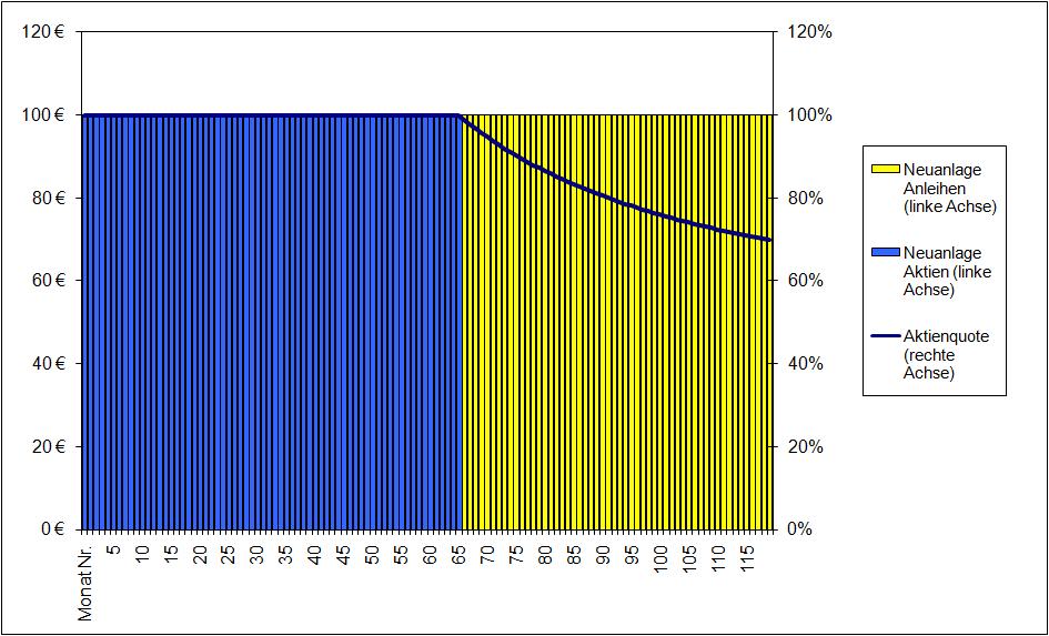(kl)einanleger November 21, 2008 · bearbeitet November 21, 2008 von (kl)einanleger Die ganze Rechnung auf Basis hypothetisch gleichbleibender Aktienwertentwicklung ist mE unrealistisch. Einfach von Anfang an auf 70:30 hin sparen. Je nach dem, ob Aktien oder Anleihen besser laufen, wird nachgekauft und die 70:30 wieder hergestellt... Du hast Recht, dass man im Laufe der Zeit keinen so glatten Verlauf der Aktienquote wie in den Beispielen hinbekommt. Aktien schwanken halt in der Regel (1 Standardabweichung) so zwischen ca. +30 Prozent und - 10 Prozent pro Jahr. Ich denke jedoch, dass man sich nach 10 Jahren - also gegen Ende des Sparplans - langsam mittleren Werten annähert. Und wenn man allein auf den Endwert schaut, dann ist die Rechnung gar nicht so unrealistisch. Man könnte beispielsweise einen Korrekturmechanismus einbauen, wenn man auch im Verlaufe des Sparplans exakt definierte Rendite/Risiko-Strukturen haben möchte und die Ist-Allokation hiervon zu stark abweicht. Im Übrigen halte ich es eher nach dem alten Sprichwort: "Planung ist die Ersetzung des Zufalls durch den Irrtum." Und hier ergibt die Planung, dass man schon beizeiten mit dem Kauf von Anleihen oder sonstigen sicheren Anlageinstrumenten beginnen sollte. Interessehalber habe ich die "Risikoarmer Aktiensparplan ohne Umschichten"-Strategie ® mal für Deinen Aktienanteil von 70 Prozent durchgespielt: Wenn man dieser Strategie folgt, dürfte man nach 67 Monaten nur noch Anleihen kaufen um in 10 Jahren einen Aktienanteil von ca. 70 Prozent zu haben. Wahrscheinlich wirst Du bei Deiner konstanten 70/30-Strategie ebenfalls ab einem bestimmten Zeitpunkt die Neuanlagen nur noch in Anleihen fließen lassen oder entsprechend umschichten müssen. Das dürfte einfach daher kommen, dass die Aktien auf Dauer wesentlich stärker steigen als die Anleihen und deshalb die gewünschte "Depotbalance" stören. Genau. Nicht komplizierter machen als es ist. Was findest Du an dieser Strategie (Kauf von Aktien vor Monat X, Kauf von Anleihen nach Monat X) kompliziert? Ich lerne gerne dazu, aber meiner Meinung nach bewegt sich das - verglichen mit anderen Strategien - eher am unteren Komplexitätsrand. Diesen Beitrag teilen Link zum Beitrag
