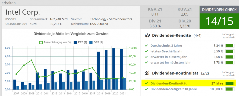 Cinquetti Juli 29, 2022 · bearbeitet Juli 29, 2022 von Cinquetti vor 9 Stunden von testaccount: Die Dividende wird's so wohl nicht mehr lange geben, FCF reicht nicht mehr lange aus. Ja, das wäre dann ein Grund die Aktie komplett zu verkaufen. Aber Intel zahlt seit 27 Jahren Dividende, von daher glaube ich nicht, dass das passieren wird. Diesen Beitrag teilen Link zum Beitrag