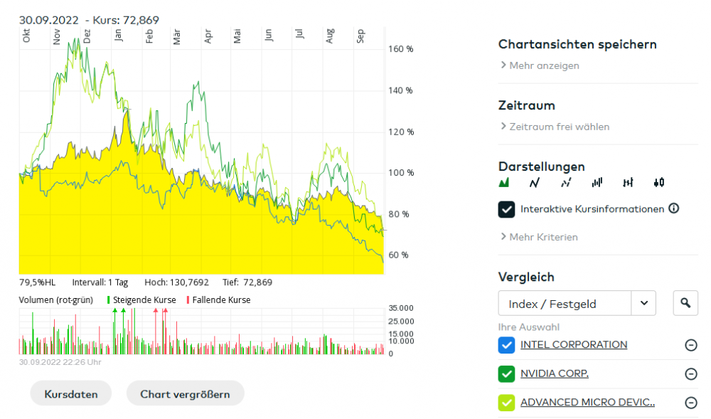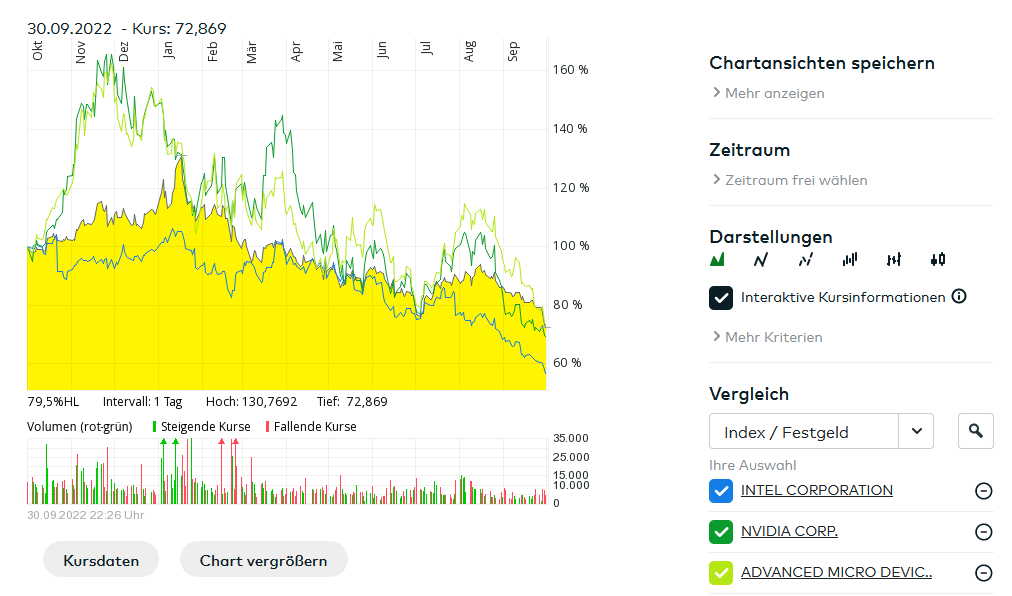 Sovereign Oktober 1, 2022 · bearbeitet Oktober 1, 2022 von Sovereign vor 2 Stunden von LongtermInvestor: Intel sieht aktuell sehr attraktiv bewertet aus. Intel's Gewinne schmelzen gerade wie der Schnee in der Sonne. Laut Markus Koch konnte Intel im 2+3 Quartal die ausgezahlten Dividenden nicht erwirtschaften. Im Vergleich zu TSMC (gelb), Nvidia und AMD schneidet der Kursverlauf von Intel am schlechtesten ab ob wohl sich der Hype um AMD und Nvidia mittlerweile ziehmlich ausgehyped hat. Also, das ich Montag morgen all mein Geld zur Bank trage um es in Intel Aktien umzutauschen sehe ich nicht. Es fehlt das Wachstum, das bei AMD und TSMC und teilweise auch bei Nvidia zu sehen ist. Diesen Beitrag teilen Link zum Beitrag