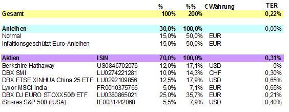 Limit November 20, 2008 Also etwa 30 % europäische Staatsanleihen. Den Aktienanteil (70 % des Gesamtkapitals) stelle ich mir folgendermaßen vor: Berkshire Hathaway US0846702076 40 % ETF auf SMI 20 % ETF auf Hang-Seng 10 % ETF auf Sensex 5 % ETF auf EuroStox50 25 % Gibt es auch einen ETF auf den SMI der die Dividenden reinvestiert (um Steurn zu sparen). Was haltet ihr grundsätzlich davon? Emerging Markets übergewichtet? Welche Anleihen empfehlt ihr? Ich dachte der Einfacheit halber an einen Fond. Ich scheue mich einen Anlageberater aufzusuchen da ich Angst habe über den Tisch gezogen zu werden und Kontrolle über mein hart verdientes Geld zu verlieren. Vielen Dank für eurer Hilfe! 40% auf eine einzige Aktie zu setzen halte ich für grob fahrlässig. Bist du Schweizer? Falls nicht, würde ich SMI komplett weglassen und ansonsten höchstens aus patriotischen Gründen ein ganz kleines wenig mit ins Depot nehmen. Statt Hang-Seng + Sensex würde ich gleich ein Asien oder besser noch ein EM-ETF nehmen. Eurostoxx50 wie schon öfters hier im Forum erwähnt durch Eurostoxx (nicht 50) ersetzen. Mein Depot würde bei deinem Anlagebetrag etwa so aussehen: 20% Euro-Staatsanleihen 10% US-Staatsanleihen 5% Inflationsindexierte Euro-Anleihen 5% Inflationsindexierte US-Anleihen 5% Unternehmensanleihen -- 20% MSCI World 10% EuroStoxx 10% MSCI EM -- 5% Rohstoffe Wie man sieht, hätte ich das ganze wesentlich konservativer gestaltet, da ich der Meinung bin, dass ab einer gewissen Größenordnung Werterhalt wesentlich wichtiger als Performance wird. Du solltest auf jeden Fall ein inflationäres Umfeld berücksichtigen, denn Inflation kann selbst das größte Vermögen schnell an Wert verlieren lassen, daher die Inflationsindexierten Anleihen und die Rohstoffe. Unternehmensanleihen mit Investment-Grade Rating haben in wirtschaftlich guten Zeiten kaum mehr Risiko als Staatsanleihen und bringen in Zeiten wie diesen wesentlich höhere Renditen. Beim Aktien-Anteil würde ich einfach eine 08/15-Aufteilung nehmen. Es mag zwar langweilig sein, was aber auch bedeutet, dass es unwahrscheinlicher ist, dass man böse Überraschungen erlebt. Da du dich ja nicht so häufig darum kümmern willst/kannst, würde ich auch den MSCI World nehmen statt der einzelnen Regionen-ETFs. Wenn du mehr EM haben willst, oder Asien übergewichten willst, würde ich als erstes den Unternehmensanleihen-Anteil weglassen). Auf ein regelmäßiges Rebelancing würde ich aber nicht verzichten wollen, selbst, wenn es nur alle paar Jahre wäre. Diesen Beitrag teilen Link zum Beitrag