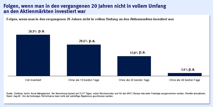 Es wird immer wieder gesagt und gezeigt, auf wie viel Rendite man verzichten muss, wenn man an den "wichtigen" Tagen nicht investiert ist (siehe Grafik aus der FAZ.NET). Typisches Argument für Buy-and Hold.