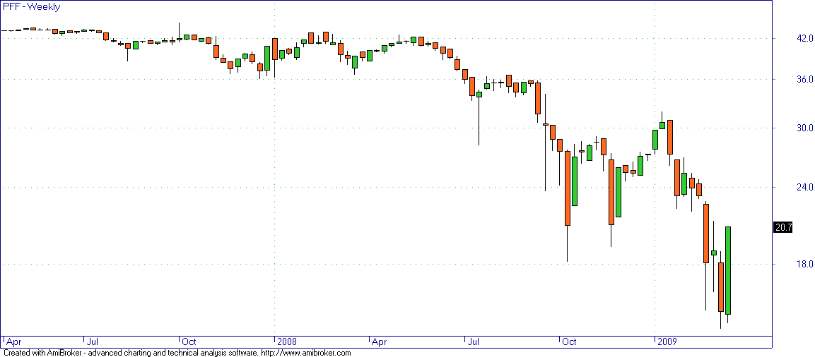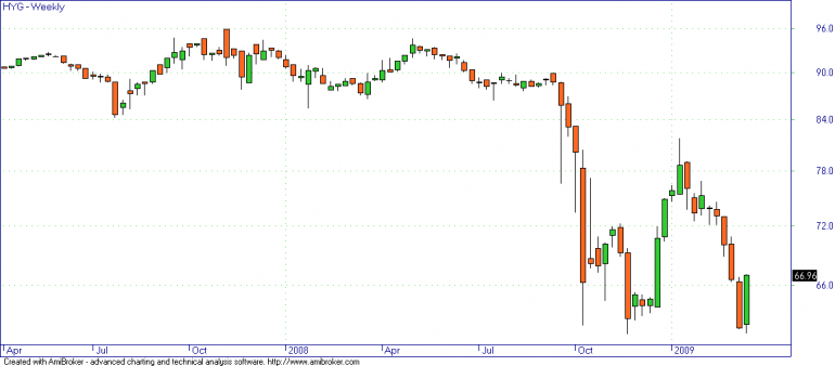 H.B. März 14, 2009 Ob die Aussagen eines "Herrn Spörer" in diesem Zusammenhang relevant sind, mag jeder für sich selbst beurteilen. Auch in den USA gibt es Hybrid-Anleihen. Anders als hier, wo die Genussscheinfonds reihenweise dicht machen, geben die beiden "preferred-Shares"-ETF's gerade wieder Lebenszeichen von sich. Hier ein Chartbild des Powershares-ETF, der Ishares läuft analog. Die Kursentwicklung der Hybrid-Anleihen kann man schon als Fiberthermometer für das Vertrauen in den Finanzsektor benutzen, da hier, anders als bei den reinen Aktienkursen, die Risiken überproportional einfließen und die Fonds überwiegend Finanztitel enthalten. Und weil es so schön ist, ein aktuelles Chartbild des High-Yield-Bond-ETF, das auch Bände spricht: Charttechnisch sind das lupenreine Kaufsignale, die mit den sinkenden Renditen aber auch eine deutliche Entspannung an dieser Front anzeigen. Diesen Beitrag teilen Link zum Beitrag