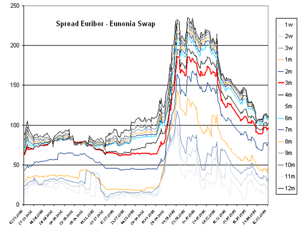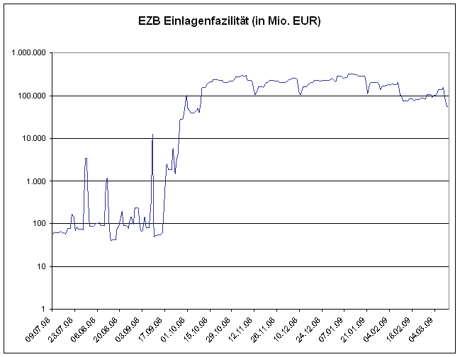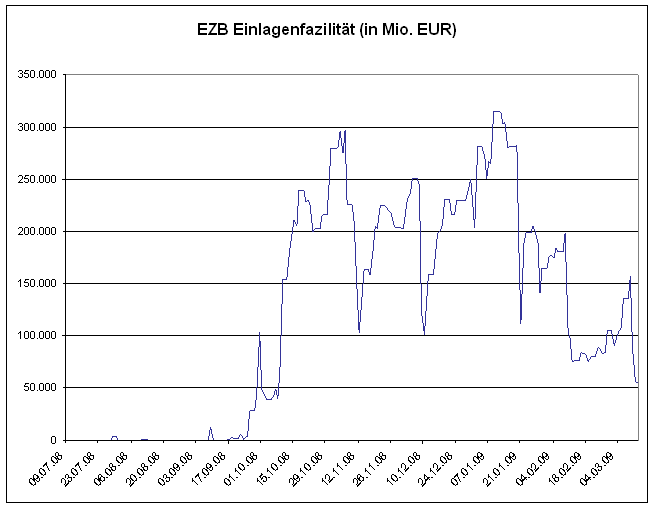 Bärenbulle März 15, 2009 Wie Torman ja schon weiter oben schrieb: Ein gutes Indiz ist aber die Nutzung der Einlagenfazilität bei der EZB. Solange die Banken dort Milliarden über Nacht parken, kann der Interbankenverkehr nicht normal funktionieren. Die EZB Einlagenfazilität ist ja zuletzt doch dann wieder sehr stark gesunken. Hier mal ein Rückblick über die Entwicklung: Sieht doch gar nicht mal so schlecht aus oder? Diesen Beitrag teilen Link zum Beitrag