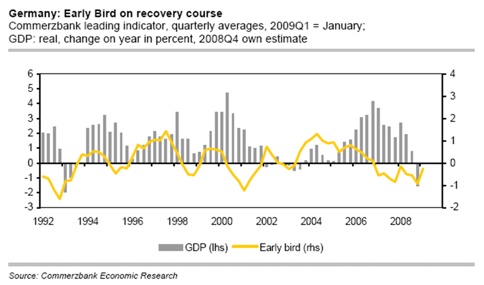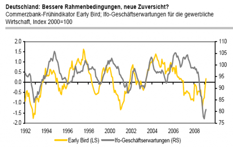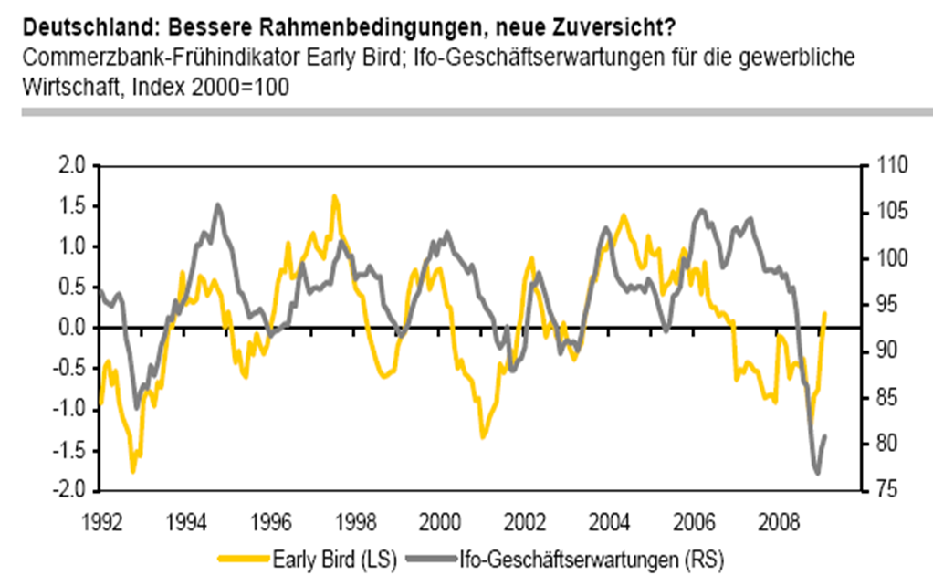 Bärenbulle März 14, 2009 · bearbeitet März 14, 2009 von Bärenbulle Good news vom neuen Early-Bird-Update 9.3.09: Der Early Bird ist im Februar erneut deutlich von -0,21 auf 0,19 gestiegen. Die Erwartung einer neuerlichen Zinssenkung der EZB und die allmähliche Entspannung am Geldmarkt ließen den 3-Monats-Euribor im Monatsdurchschnitt um mehr als 50 Basispunkte fallen. Weiterhin sehr ungünstig bleibt das weltwirtschaftliche Umfeld, auch wenn der Einkaufsmanagerindex für die US-Industrie, den wir hier als Proxy verwenden, im Februar leicht zugelegt hat. Kaum ins Gewicht fällt derzeit die Entwicklung des Außenwertes, der leicht gefallen ist. Der Anstieg des Early Birds über null ist ein weiterer Hoffnungsschimmer für die Konjunktur in Deutschland. In den vergangenen 15 Jahren zeigte ein Vorzeichenwechsel des Indikators zuverlässig einen Hoch- bzw. Tiefpunkt beim Vorjahresvergleich des Bruttoinlandsproduktes an. Dies spricht für den weiteren Jahresverlauf zumindest für eine spürbare Verringerung der Fallgeschwindigkeit der Wirtschaft. Zudem dürften in den kommenden Monaten auch von den anderen Frühindikatoren positive Signale kommen. So weist der Early Bird gegenüber den Ifo- Geschäftserwartungen einen leider in Hinblick auf die Länge nicht konstanten Vorlauf auf (Grafik). Außerdem erwies sich bei überdurchschnittlichen Rahmenbedingungen also einem Early Bird über null eine Verbesserung der Ifo-Geschäftserwartungen bisher nie als Fehlsignal. Für sich genommen ist der Anstieg der Geschäftserwartungen in den letzten zwei Monaten kein sicheres Signal für eine bevorstehende Konjunkturwende; die jüngste Entwicklung des Early Bird erhöht allerdings seine Zuverlässigkeit. Damit ist der Early Bird einer der bisher recht wenigen Indikatoren, die zumindest etwas Hoffnung für die Konjunktur in Deutschland machen. Sein aktueller Stand stützt unsere Erwartung, dass sich die deutsche Wirtschaft im weiteren Jahresverlauf stabilisieren wird. Mit einer Belebung, die auch eher schleppend verlaufen dürfte, ist aber erst 2010 zu rechnen. Diesen Beitrag teilen Link zum Beitrag