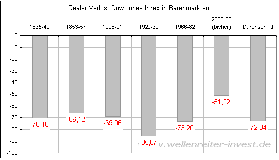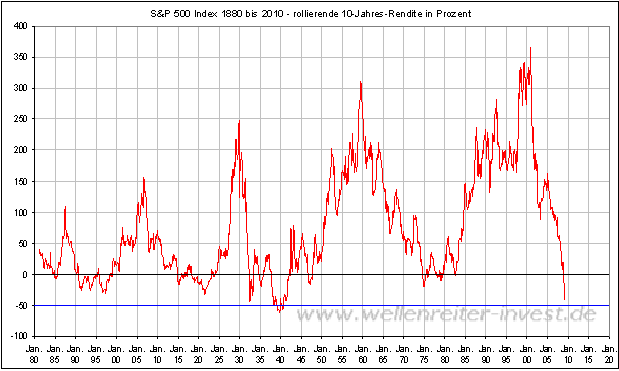 Bärenbulle März 10, 2009 · bearbeitet März 10, 2009 von Bärenbulle Neue Analyse der Wellenreiter: http://www.wellenreiter-invest.de/Wellenre...eiter090228.htm Die rollierende 10-Jahres-Rendite befindet sich aktuell bei -41 Prozent. Ein derart niedriger Wert wurde lediglich in der großen Depression der 30er Jahre erzielt. Das Tief der rollierenden Rendite stammt aus dem Jahr 1939. Das ist kein Wunder, weil sich die Rendite auf das Jahr 1929 bezog. Aktuell geht der Bezug auf den Februar 1999 zurück. Das bedeutet, dass bei einem gleichbleibendem oder weiter fallenden S&P 500 ein weiterer Fall der rollierenden 10-Jahres-Rendite zu erwarten wäre. Nur ein steigender S&P 500 kann einen weiteren Fall verhindern. Beispielweise würde ein S&P 500 von mindestens 840 Punkten zum Jahresende 2009 einen Anstieg der rollierenden 10-Jahres-Rendite auslösen. In jedem Fall sind aktuell bereits historische Ausmaße erreicht worden. Das erste Zitat vom Wellenreiter teile ich. Das zweite folgende halte ich für ziemlich an den Haaren herbeigezogen. Wer seine Theorien im Choas versucht anhand von Mustern zu bestätigen, der wird auch welche Finden die die Theorie bestätigen, wenn er nur lange genug sucht. Noch einmal zurück zum inflationsbereinigten (realen") Dow Jones Index. Dieser hat in den vergangenen 200 Jahren mit schöner Regelmäßigkeit in großen Bärenmärkten Verluste zwischen 65 und 85 Prozent eingefahren. Der Durchschnittswert befindet sich bei einem Minus von knapp 73 Prozent. Fazit: Auch wenn aktuell in Dow und S&P 500 historische Bewegungen registriert werden, denen ein Zwischenspurt in diesen Indizes folgen dürfte, so sind die historischen Verluste bisher vergleichsweise gering. Der Bärenmarkt sollte daher noch einige Jahre andauern. Ein realer Verlust im Bereich von 65 bis 85 Prozent ist am schnellsten mit steigenden Inflationsraten zu erreichen. Für einen Anstieg der Inflation ist es jedoch noch zu früh. Verfolgen Sie unsere Indikatoren in unserer handelstäglichen Ausgabe. Diesen Beitrag teilen Link zum Beitrag