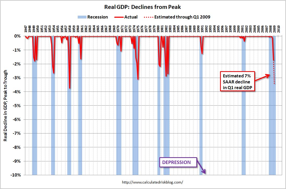 Bärenbulle März 11, 2009 · bearbeitet März 11, 2009 von Bärenbulle Guter Artikel um die "Schwere" der aktuellen Krise einordnen zu können. What is a depression?It seems like the "D" word is everywhere. And that raises a question: what is a depression? Although there is no formal definition, most economists agree it is a prolonged slump with a 10% or more decline in real GDP. Yesterday I heard an analyst say that a 10% unemployment rate is a depression. But the unemployment rate peaked at 10.8% in 1982, and that period is usually not considered a depression. Some people argue the duration of the economic slump defines a depression - and the current recession is already 15 months old. That is longer than the recessions of '90/'91 and '01. The '73-'75 recession lasted 16 months peak to trough, and the early '80s recession (a double dip) was classified as a 6 month recession followed by a 16 month recession (22 months total). Those earlier periods weren't "depressions", so if duration is the key measure, the current recession still has a ways to go. Here is a graph comparing the decline in real GDP for the current recession with other recessions since 1947. Depression is marked on the graph as -10% Q1 2009 is estimated at a -7.0% decline in real GDP (Seasonally adjusted annual rate). This will push the cumulative decline (peak to trough) to about 3.4%. Even though the current recession is already one of the worst since 1947, it is only about 1/3 of the way to a depression (assuming a terrible Q1 To reach a depression, the economy would have to decline at about a 6.6% annual rate each quarter for the next year. The second graph compares the current recession (estimated through Q1 2009) with the more severe recessions of the last century. Note that the data is annual for the pre-1947 economic slumps. The Great Depression saw real GDP decline 26.5%. The post-WWII recession lasted 8 months and saw real GDP decline 13%. This decline in GDP was due to winding down the war effort - something that was celebrated - and is excluded when analysts call the current slump the "worst since the Great Depression". I still think a depression is very unlikely. More likely the economy will bottom later this year or at least the rate of economic decline will slow sharply. I also still believe that the eventual recovery will be very sluggish, and it will take some time to return to normal growth. Quelle: http://www.calculatedriskblog.com/2009/03/...depression.html Diesen Beitrag teilen Link zum Beitrag