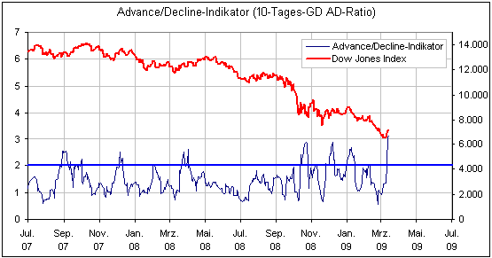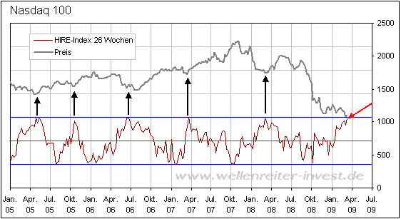 Bärenbulle März 22, 2009 · bearbeitet März 22, 2009 von Bärenbulle Wenn ein Paar erklärende Worte dazu vergeben würden, nicht alle sind vom Fach (Icke, z.B.) ... nochmal zurück zu den CoT Daten. Wellenreiter argumentiert sehr stark darüber und die haben bei den eher erfahreneren Teilnehmern hier ja einen ziemlich guten Ruf. Wellenreiter hat sogar den sogenannten HIRE-Index daraus gemacht. Der wird hier erklärt: http://www.infos.com/de/marktgeschehen_lig...ellenreiter.pdf Bisher hat er angeblich alle Wendepunkte ziemlich präzise vorhergesagt. Auch jetzt zeigt er (zumindest mittelfristig steigende Kurse an: Wellenreiter schreibt: Der HIRE-Indikator hat seine obere Begrenzung so gut wie erreicht. Das Signal ist deutlich genug, um den Beginn einer Aufwärtsbewegung zu signalisieren. Außerdem verweisen Sie auf den AD Indicator: Martin Zweig beschreibt den Indikator in seinem Buch Winning on Wall Street". Mit dem Advance/Decline Indikator bezeichnet Zweig den 10-Tages-GD der steigenden, geteilt durch die fallenden Aktien (NYSE). Steigen an einem bestimmten Tag 2000 Aktien und 1000 Aktien fallen, so beträgt die AD-Ratio zwei zu eins. Wiederholt sich dieser Vorgang 10 Tage hintereinander, so erhält man einen 10-Tages-GD mit einem Wert von zwei. Martin Zweig bezeichnet einen 10-Tages-GD der AD-Ratio von zwei oder mehr als ein deutlich bullisches Ereignis. Dieser erreicht mit 3,2 einen Wert, der in den vergangenen 40 Jahren nur dreimal zuvor übertroffen wurde, darunter zu Beginn des Bullenmarktes im August 1982. Das Auftreten eines solchen Signals ist als deutlich positiv zu bewerten. Insgesamt ist die Qualität des jüngsten Preistiefs mit Blick auf die Marktinterna deutlich besser als im November (Volumensextrema in unmittelbarer Nähe des Preistiefs; abnehmende Anzahl neuer Tiefs vom Oktober- über Novembertief hin zum Märztief als Indiz eines abnehmendes Verkaufsdrucks; steigendes Volumen bei einem Preisanstieg). Der hat allerdings meiner skeptischen Meinung nach in letzter Zeit ein bisschen zu häufig ausgeschlagen. Zwar geht Wellenreiten daher jetzt von einem mittelfristigen Bullenmarkt aus, aber sind noch nicht so überzeugt, ob wir uns auf lange Sicht nicht ähnlich der Situation 1939 und den Folgejahren befinden, wo das Tief nach vier Jahren nochmal getestet wurde. Für einen langfristigen Bullenmarkt hätten ihrer Meinung nach noch folgende Bedingungen erfüllt sein sollen: Perfekt ist dieses Tief jedoch nicht. Angst-Spikes in der Put-Call-Ratio lagen nicht vor. Auch ist der TRIN so gut wie nicht angesprungen. http://www.wellenreiter-invest.de/index.html TRIN: Der vom US-Investmentbanker Richard W. Arms entwickelte ARMS-Index (auch TRIN = Trading Index) steigt, wenn das Volumen der Verliereraktien höher ist als die Umsätze der Gewinner. Geschieht das über einen längeren Zeitraum hinweg, entsteht eine überverkaufte Marktsituation, die eine Gegenbewegung nach oben erwarten läßt. Der Index berechnet sich wie folgt: Gewinner/Verlierer durch Volumen aus Gewinner/Verlierer. Als Faustformel gilt: Indexstand über 1 = kaufen, unter 1 = verkaufen. Diesen Beitrag teilen Link zum Beitrag