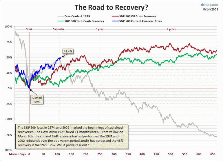 Meiner Meinung nach kann die Zeitperioden nicht ohne weiteres vergleichen, man sieht schon im Chart dass der Markt in 50 Tagen vor Stichtag im März 2009 lediglich 25% höher lag während im 1929 sich der Markt sich der Markt innerhalb von 50 Tagen vor dem Stichtag fast halbierte.
