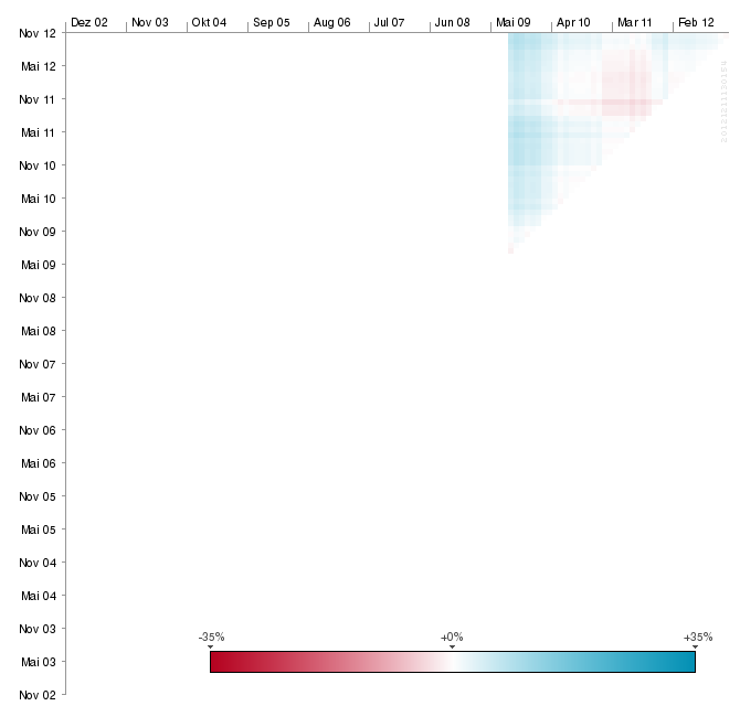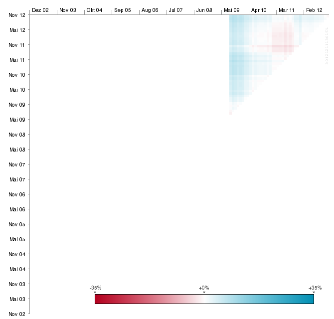 vanity Dezember 31, 2012 · bearbeitet Dezember 31, 2012 von vanity ... Alter Hut ... Das ist doch schon Ansatz! Einfach noch die Abszissen- und Ordinatenwerte vertauschen, so dass das Dreieck unterhalb der Winkelhalbierenden zu liegen kommt, die Farbgebung von blau auf grün umstellen und den Farbverlauf nicht über weiß, sondern die Mischfarbe (braun?) führen, damit man bei ausgeglichener Performance auch was erkennt. Wenn man dann noch den leeren Bereich oberhalb der Winkelhalbierenden bei umgekehrter Skalierung für einen weiteren Fonds nutzt und ein vollständiges Koordinatensystem mit vier Quadranten einsetzt, wird es möglich vier Fonds (oder zwei nebst ihrer jeweiligen Benchmark) paarweise visuell zu analysieren. Der Ethna Defensiv trackt seine Benchmark übrigens wesentlich besser als der Aktiv, wenn man nicht boshafterweise diesen Zeitraum auswählt und scheint mir auch sonst die besseren Kennzahlen (Rendite, MDD, Vola) aufzuweisen. Zudem begnügt er sich mit einer performance fee von bescheidenen 10% der über 5% hinausgehenden Performance (ggü. 20% beim Aktiv). Diesen Beitrag teilen Link zum Beitrag