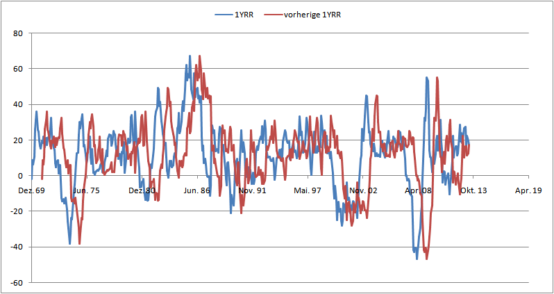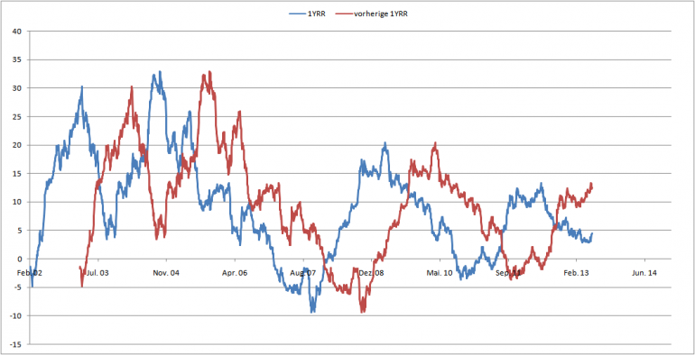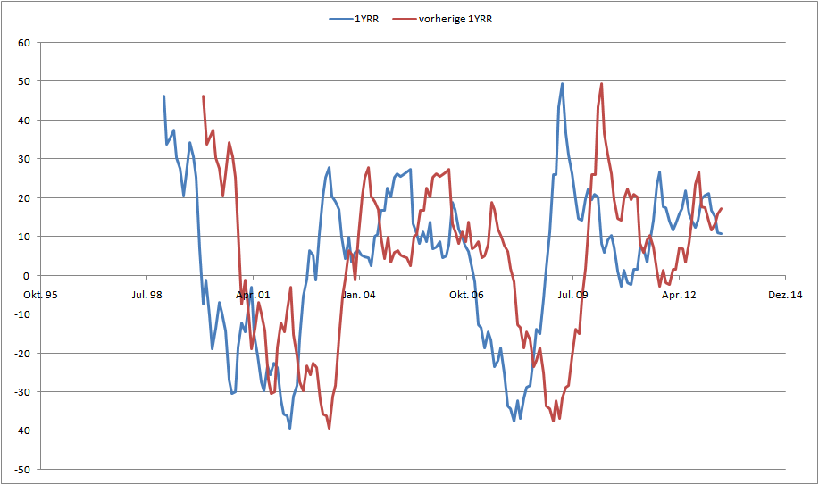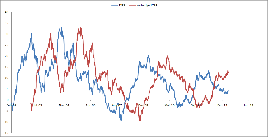Die extra Einzeichnung der vorherigen Rendite ist lediglich für die einfachere Lesbarkeit dar. Die Information selbst ist aber bereits in einem einfachen Diagramm der roll. Renditen enthalten. (die rote Kurve ist nichts weiter als eine Verschiebung der blauen Kurve entlang der x-Achse!)