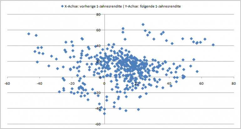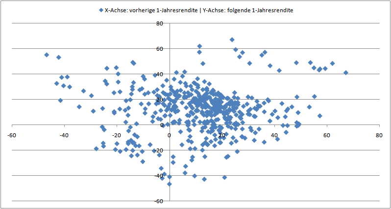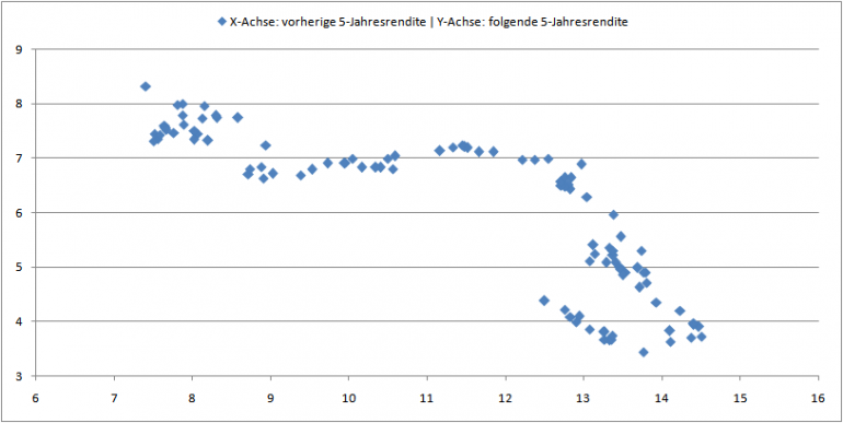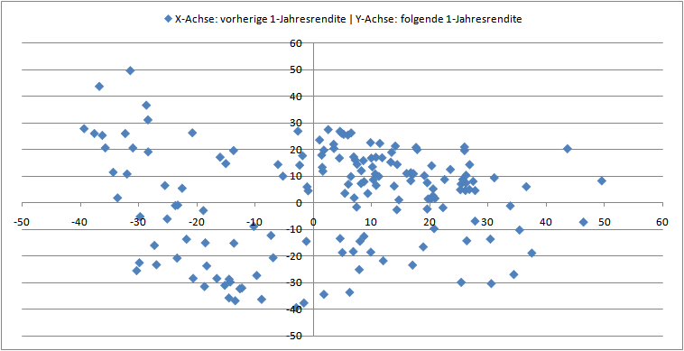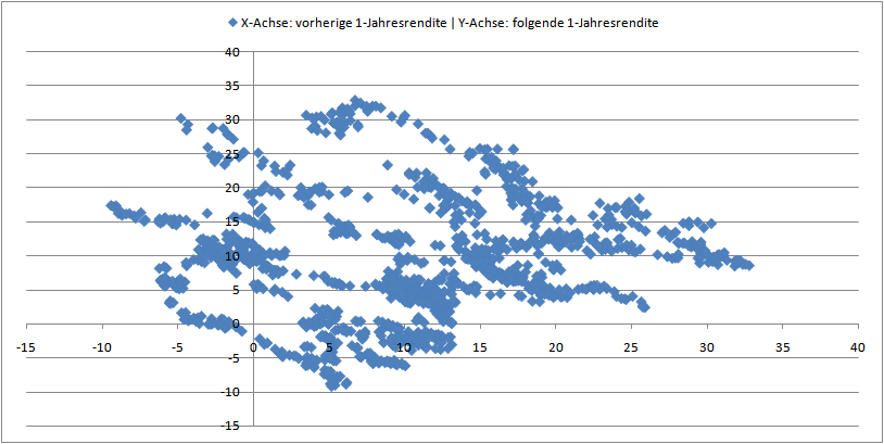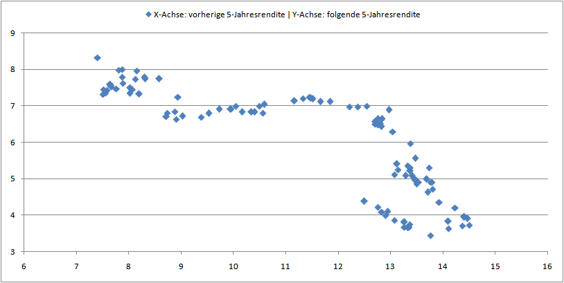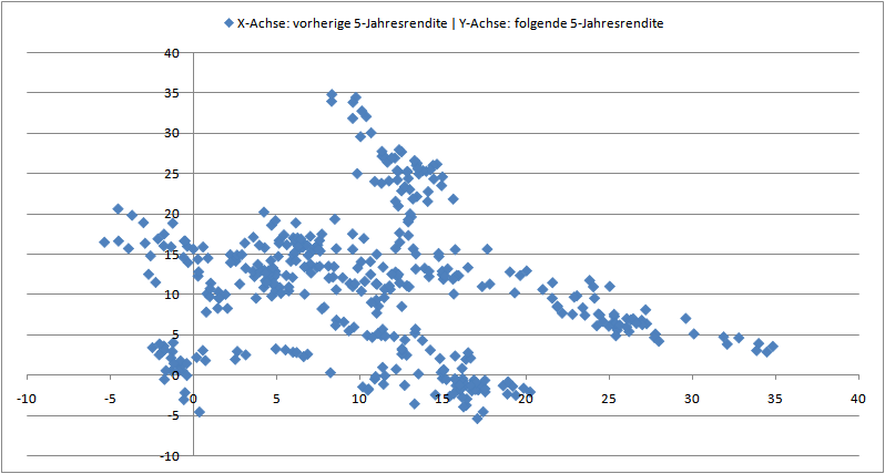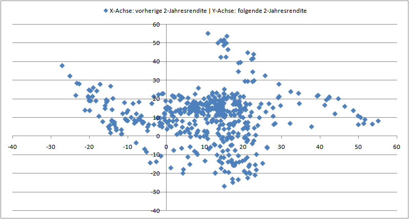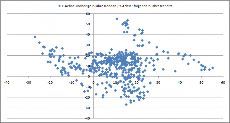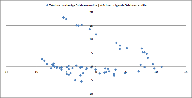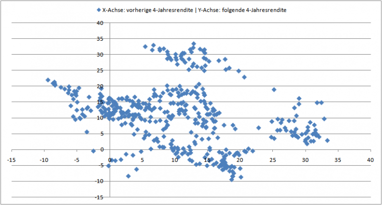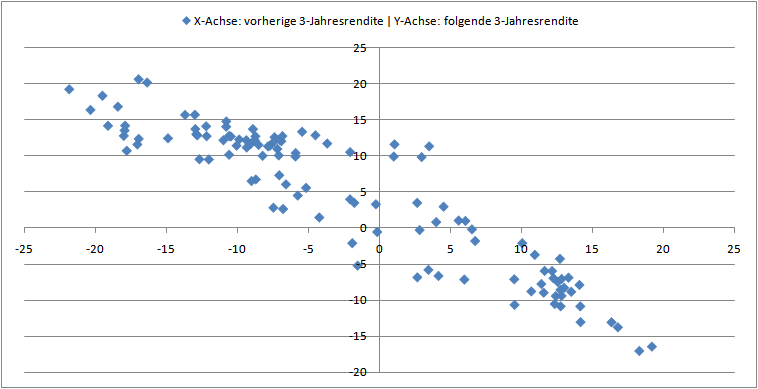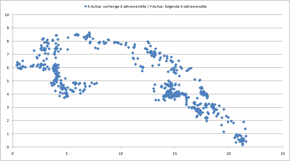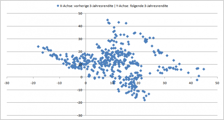 Inwieweit ein Zusammenhang zwischen vergangener und künftiger 3 Jahresrendite besteht ist dann in diesem Diagramm nochmal etwas anders dargestellt: